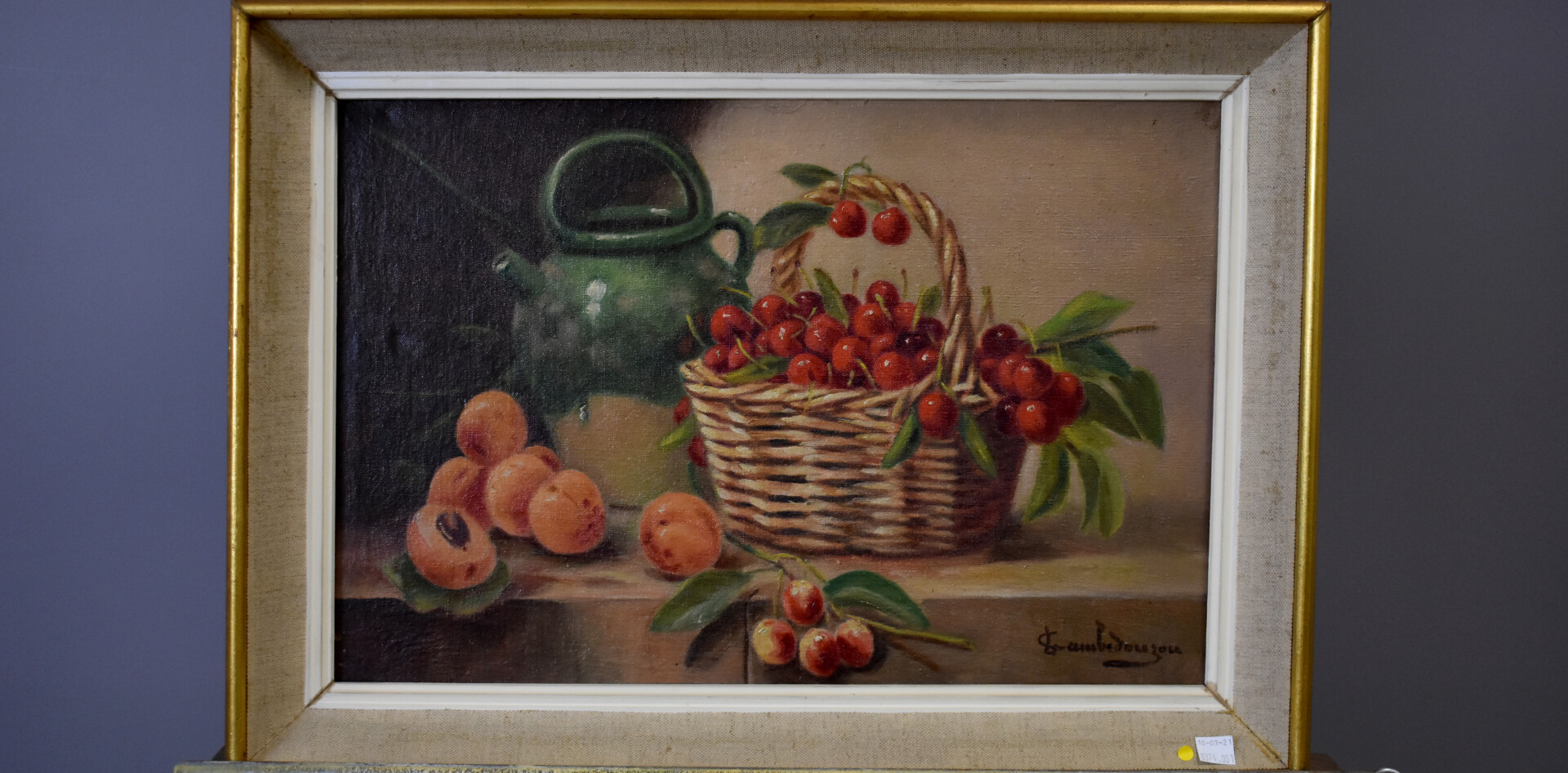 Lot n° 52 Adjugé : 60 € L. COMBEDOUZOU (XIXe-XXe siècle). Nature morte aux cerises… Estimation : 40 / 60 €