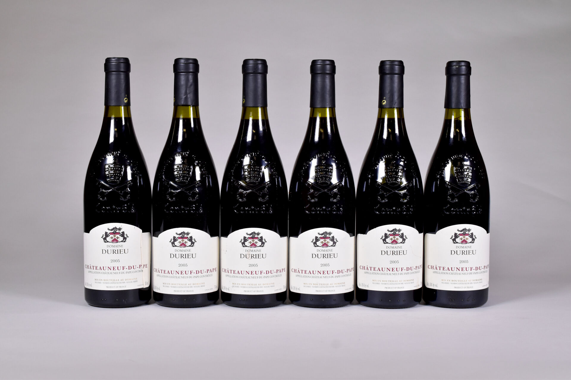 Lot n° 106 6 bouteilles, Châteauneuf-du-Pape, Domaine Durieu, 2005. Deux étiquettes… Estimation : 90 / 120 €