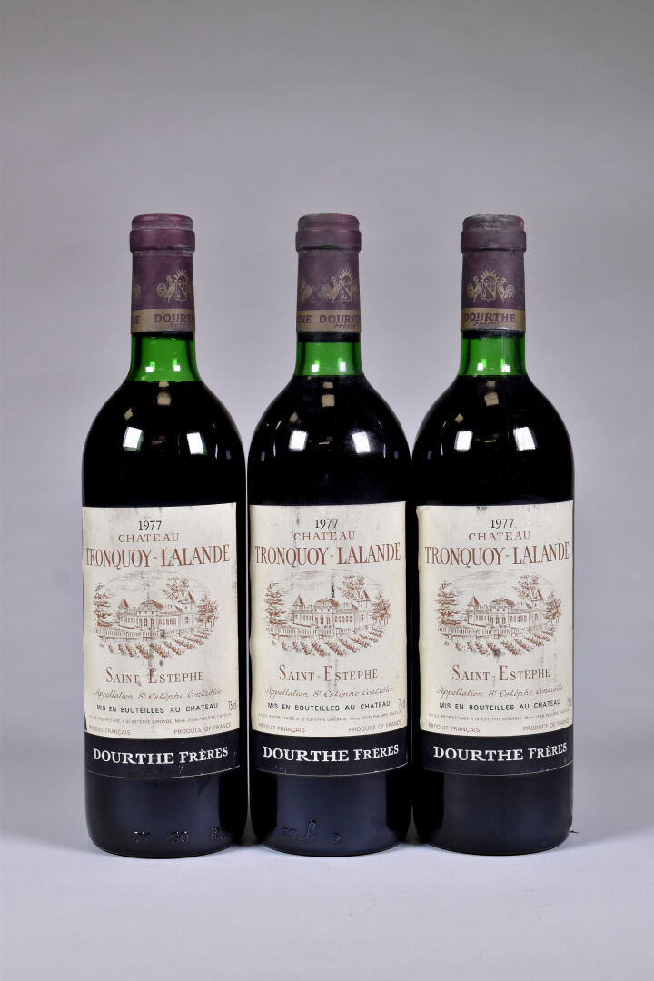 Lot n° 83 3 bouteilles, Saint-Estèphe, Château Tronquoy-Lalande, 1977. Bouchons très… Estimation : 60 / 75 €