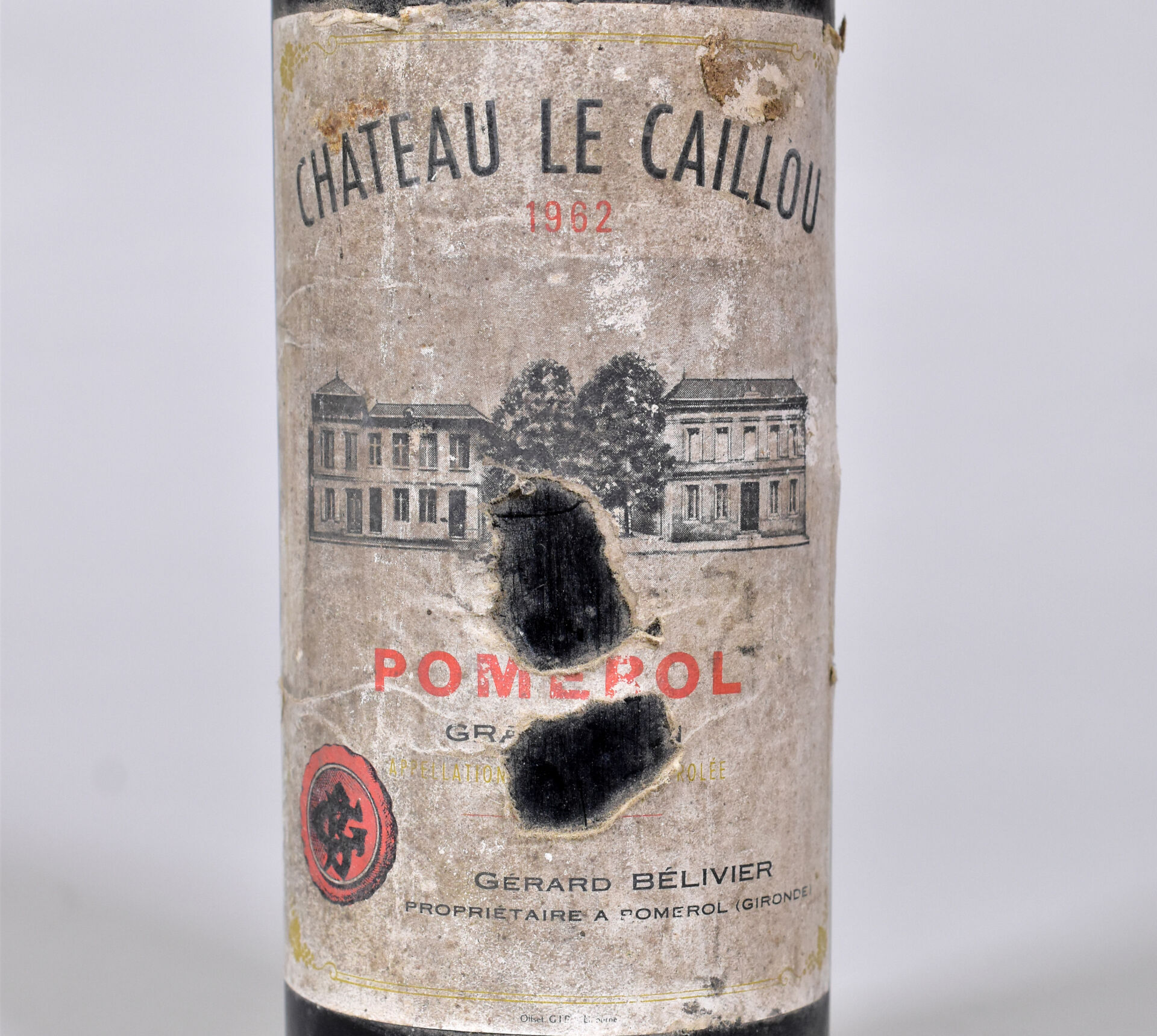 1 bouteille, Pomerol, Château Le Caillou, 1962. HE. Capsule sale et abimée. Étiquette sale et dégradée.