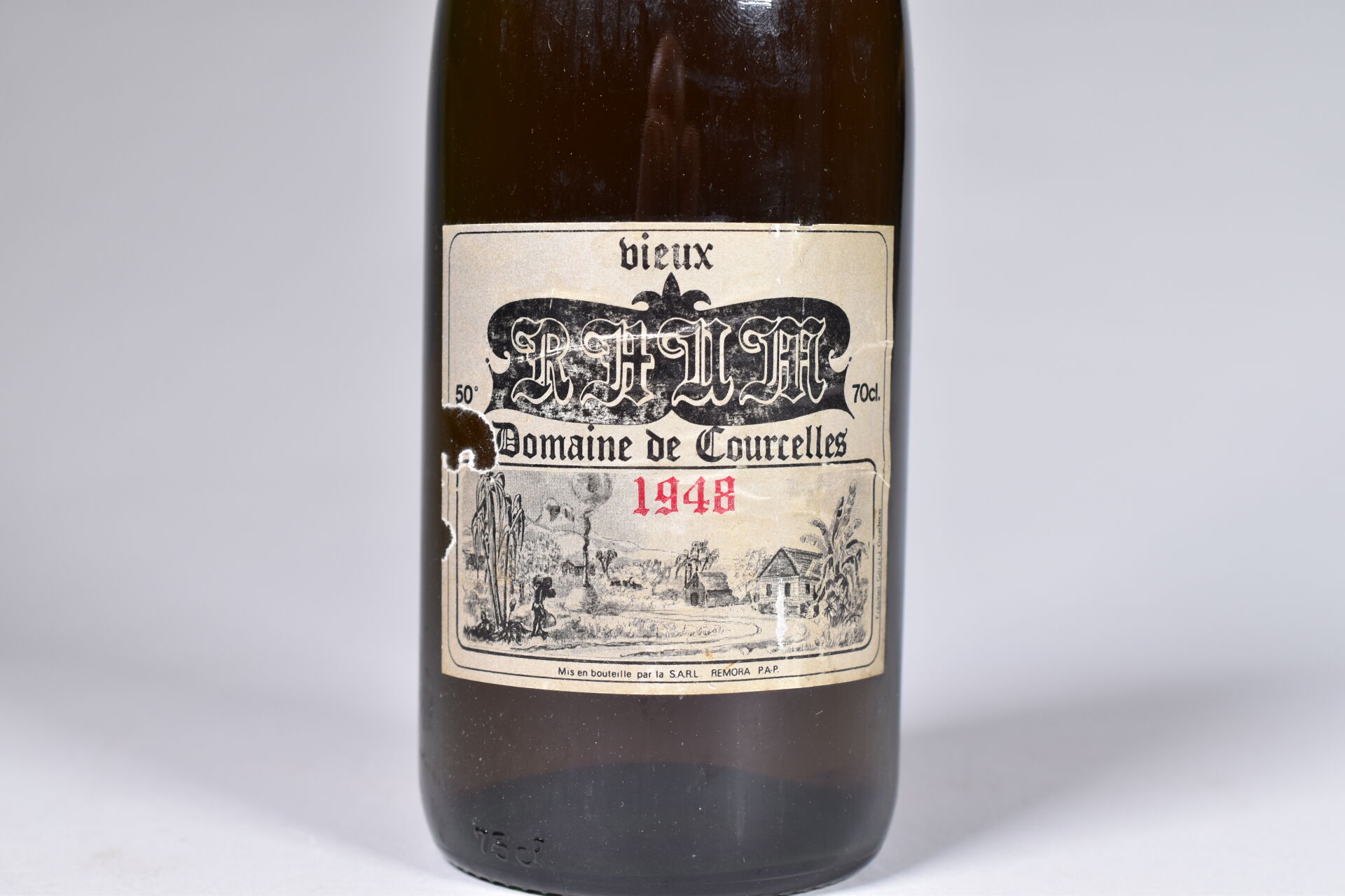 1 bouteille, Vieux Rhum, Domaine de Courcelles, 1948. 50°. 5,5 cm. Capsule en cire avec un éclat. Étiquette légèrement fanée et avec deux petites déchirures.