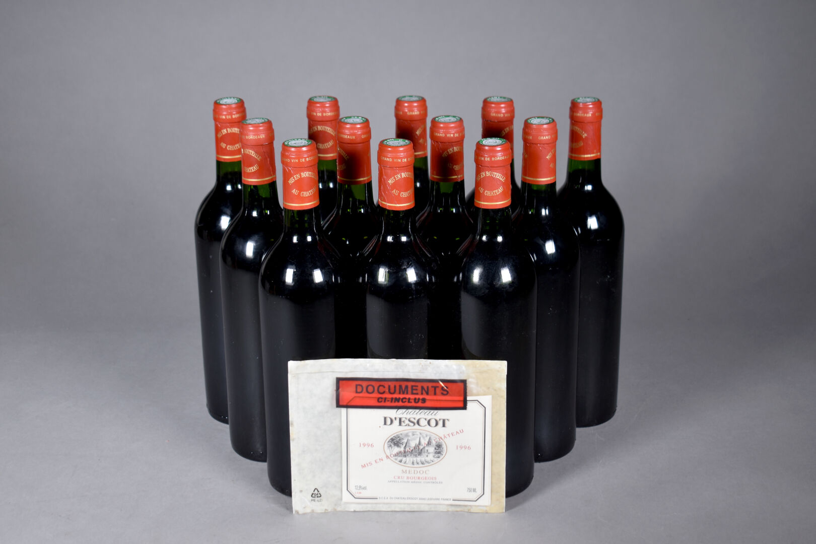 12 Bouteilles, CHÂTEAU D’ESCOT, Médoc, Cru Bourgeois 1996 . (Étiquettes jointes non collées sur bouteilles)