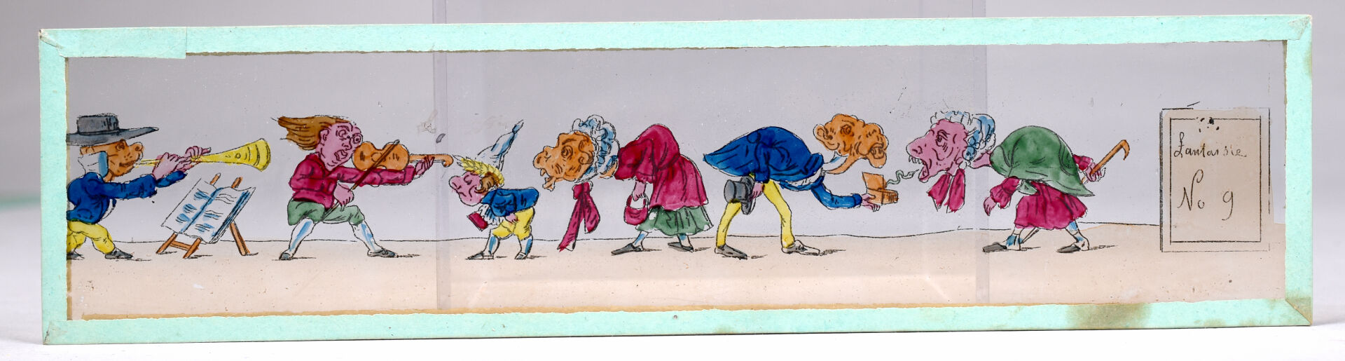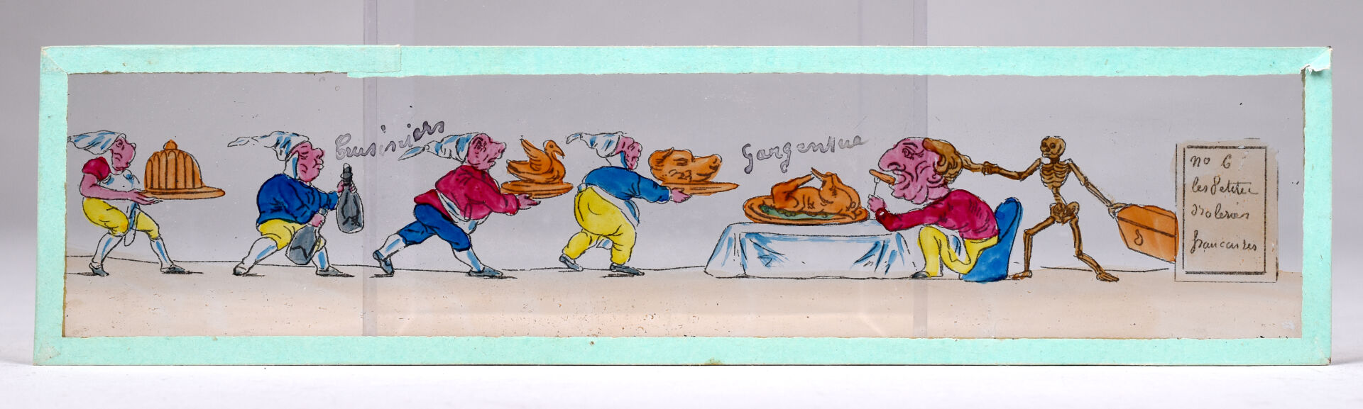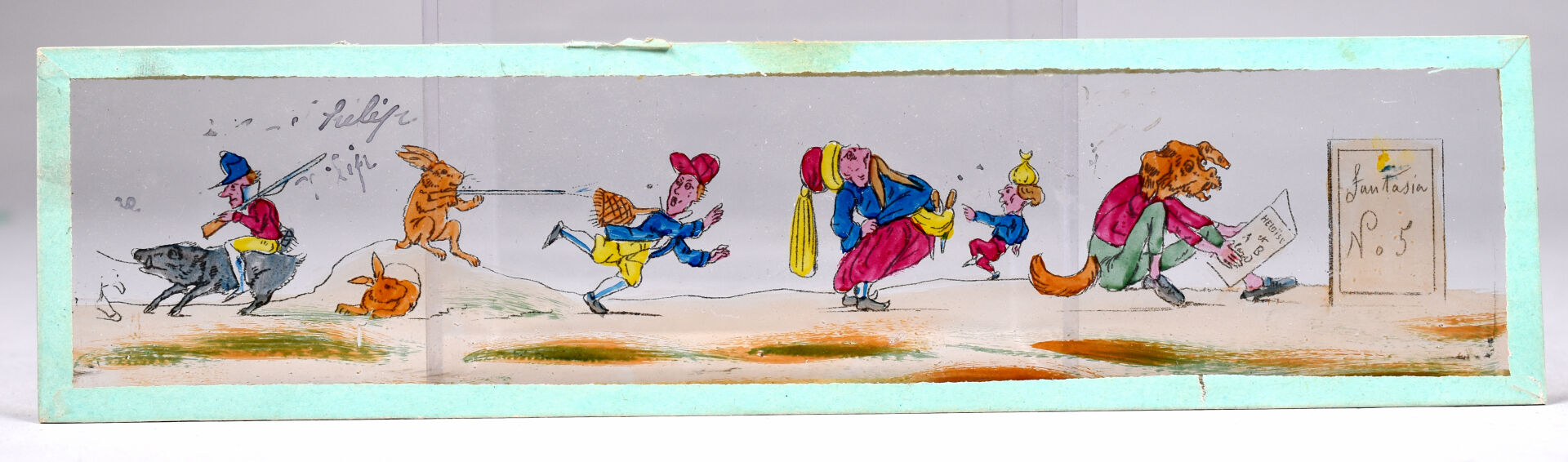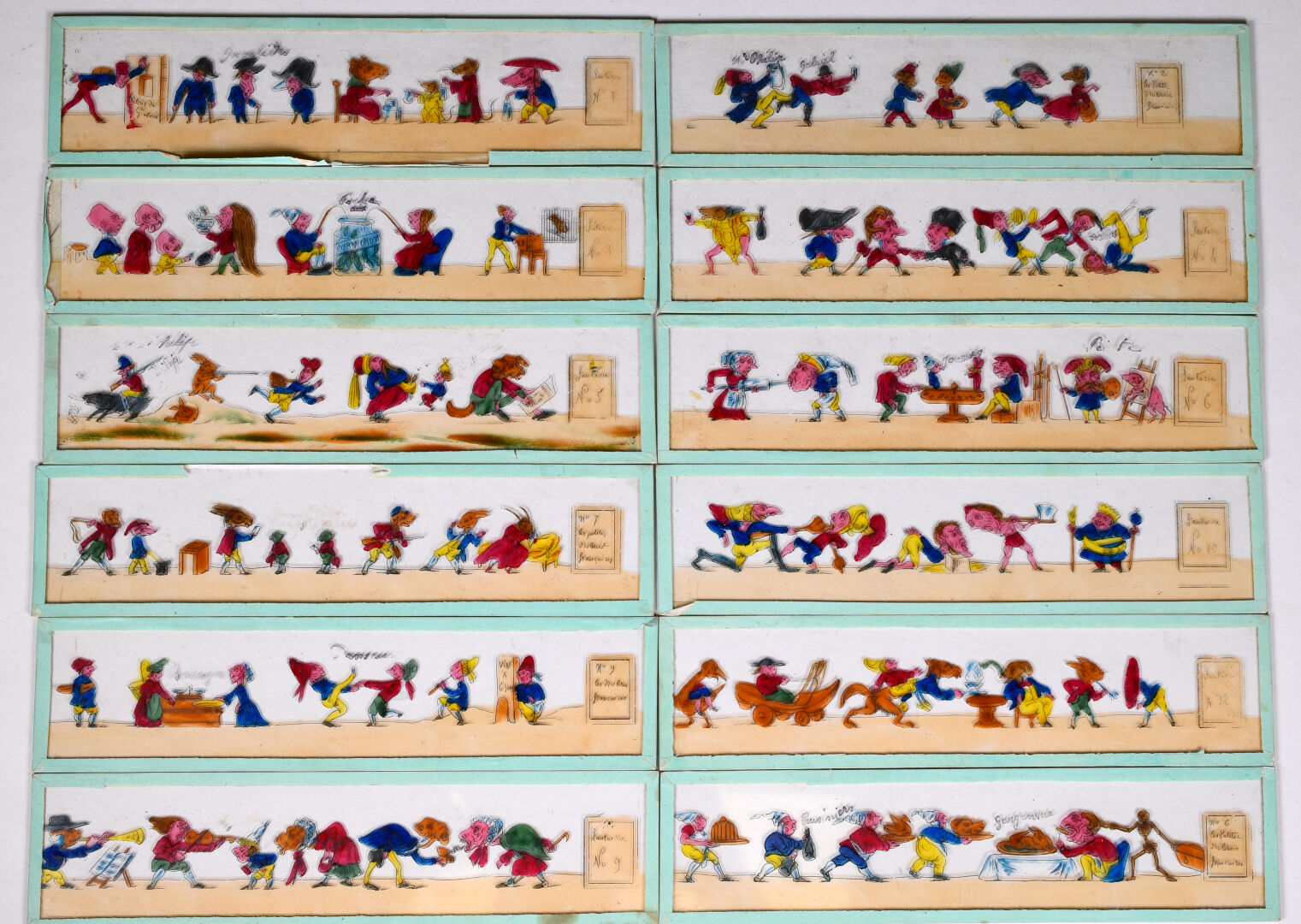 12 Plaques de verre peintes pour projecteur (traces d’humidité). Fin du XIXe ou début du XXe siècle.