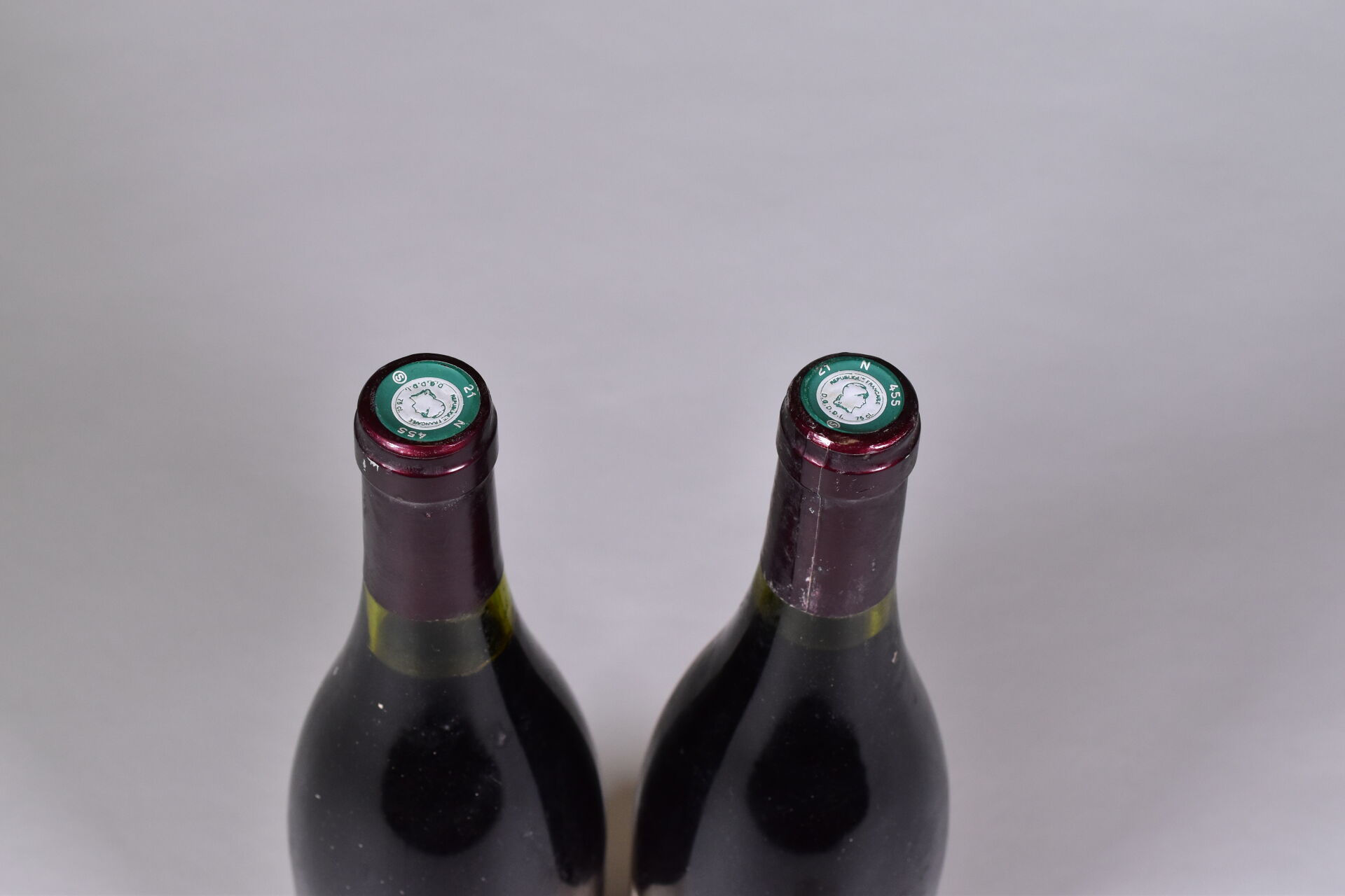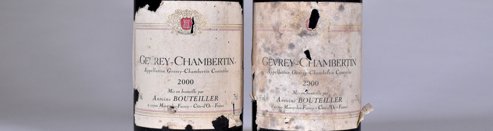 2 bouteilles, Gevrey-Chambertin, Antoine Bouteiller, 2000. Étiquettes grisées, tachées et dégradées.
