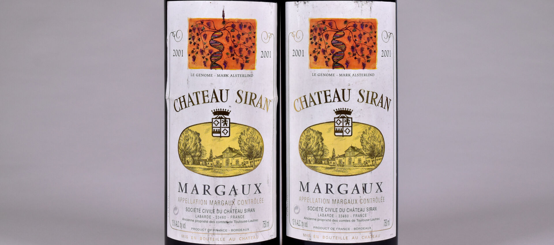 2 bouteilles, Margaux, Château Siran, 2001. Capsules légèrement abimées en bas de jupe, et quelques traces sur les étiquettes.