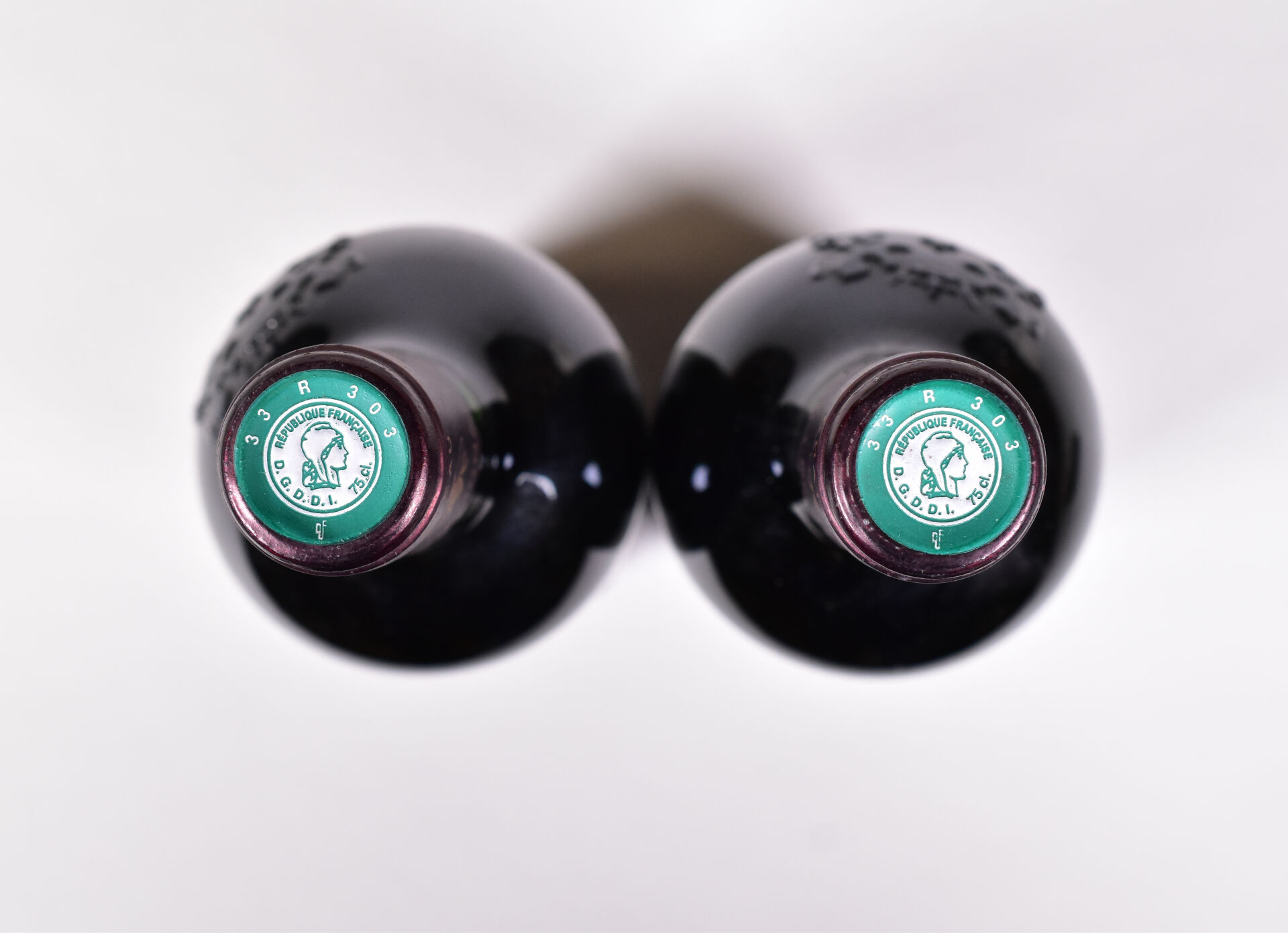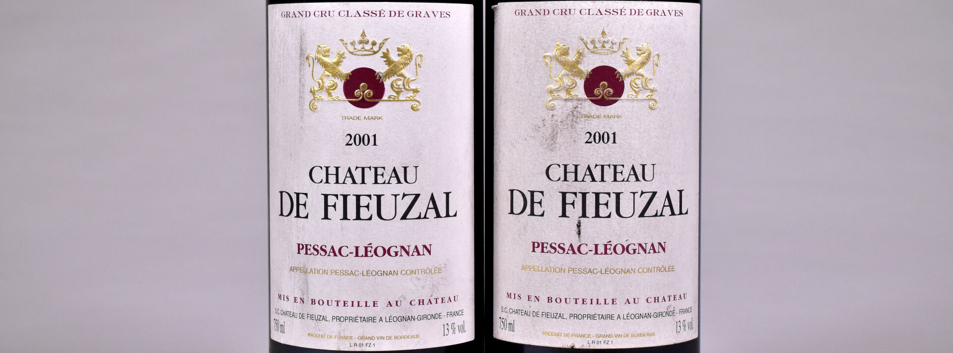 2 bouteilles, Pessac-Léognan, Château de Fieuzal, Grand Cru Classé de Graves, 2001. Capsules abimées en bas de jupe. Étiquettes légèrement sales.