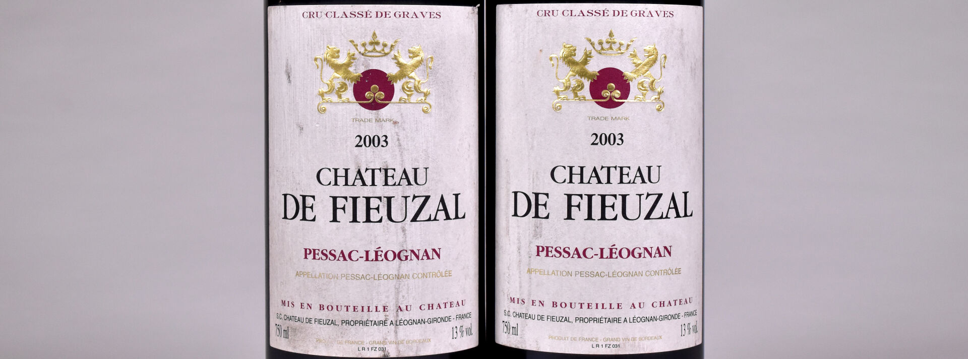 2 bouteilles, Pessac-Léognan, Château de Fieuzal, Grand Cru Classé de Graves, 2003. Étiquettes avec des salissures.