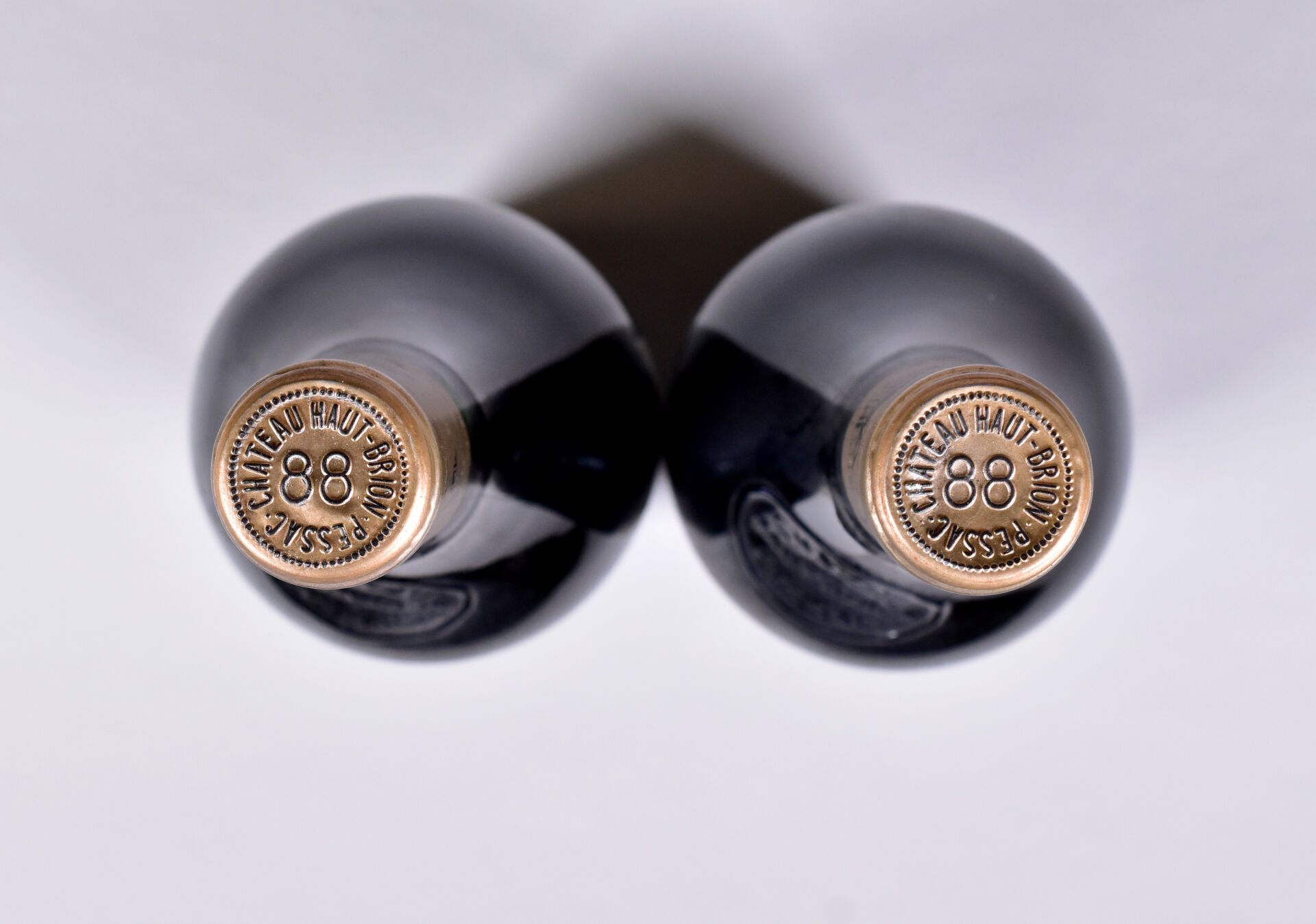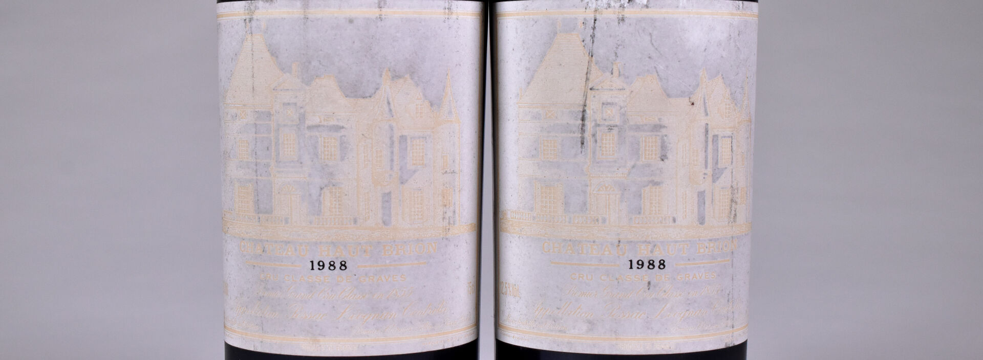 2 bouteilles, Pessac-Léognan, Château Haut-Brion, 1er Grand Cru Classé, 1988. Étiquettes fanées et légèrement sales.
