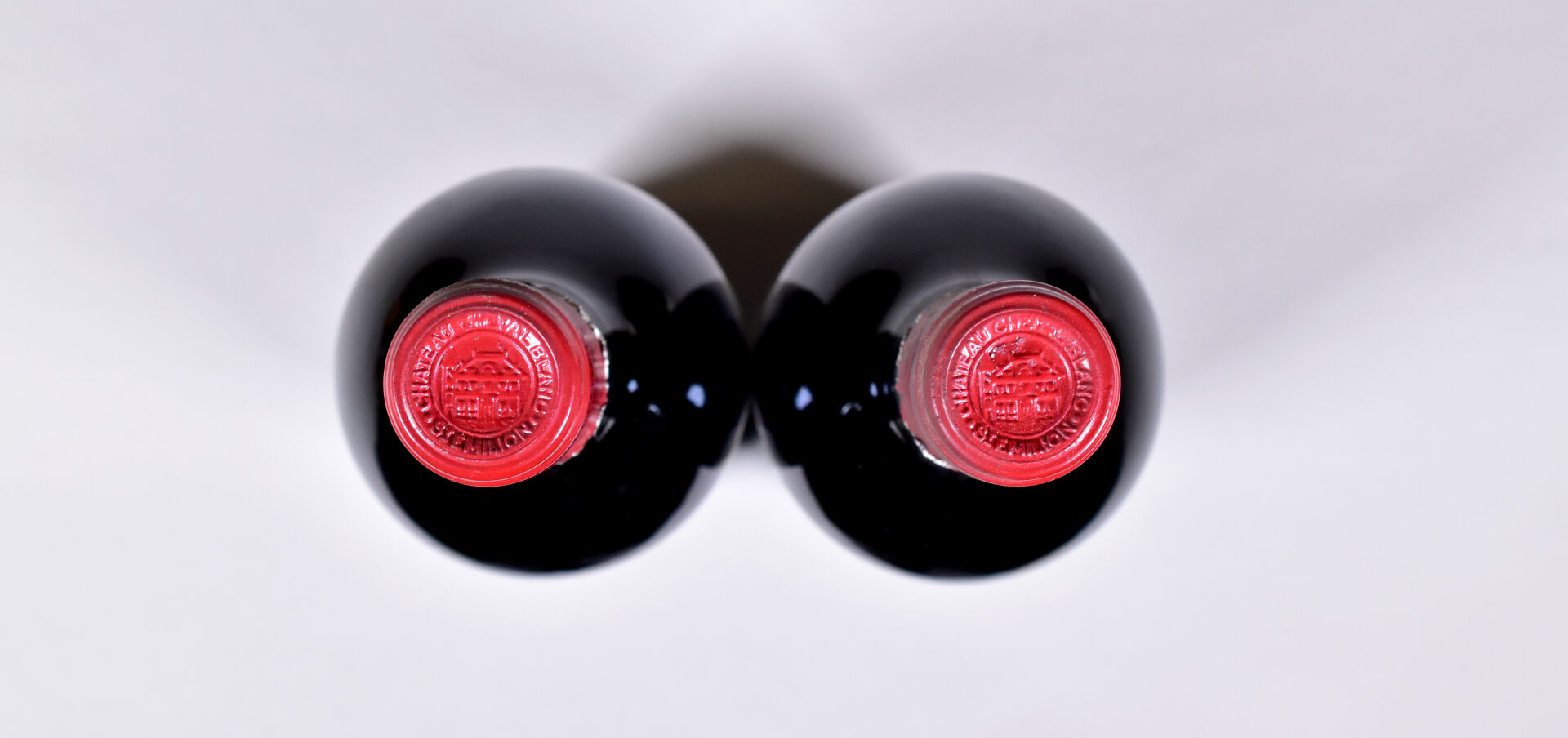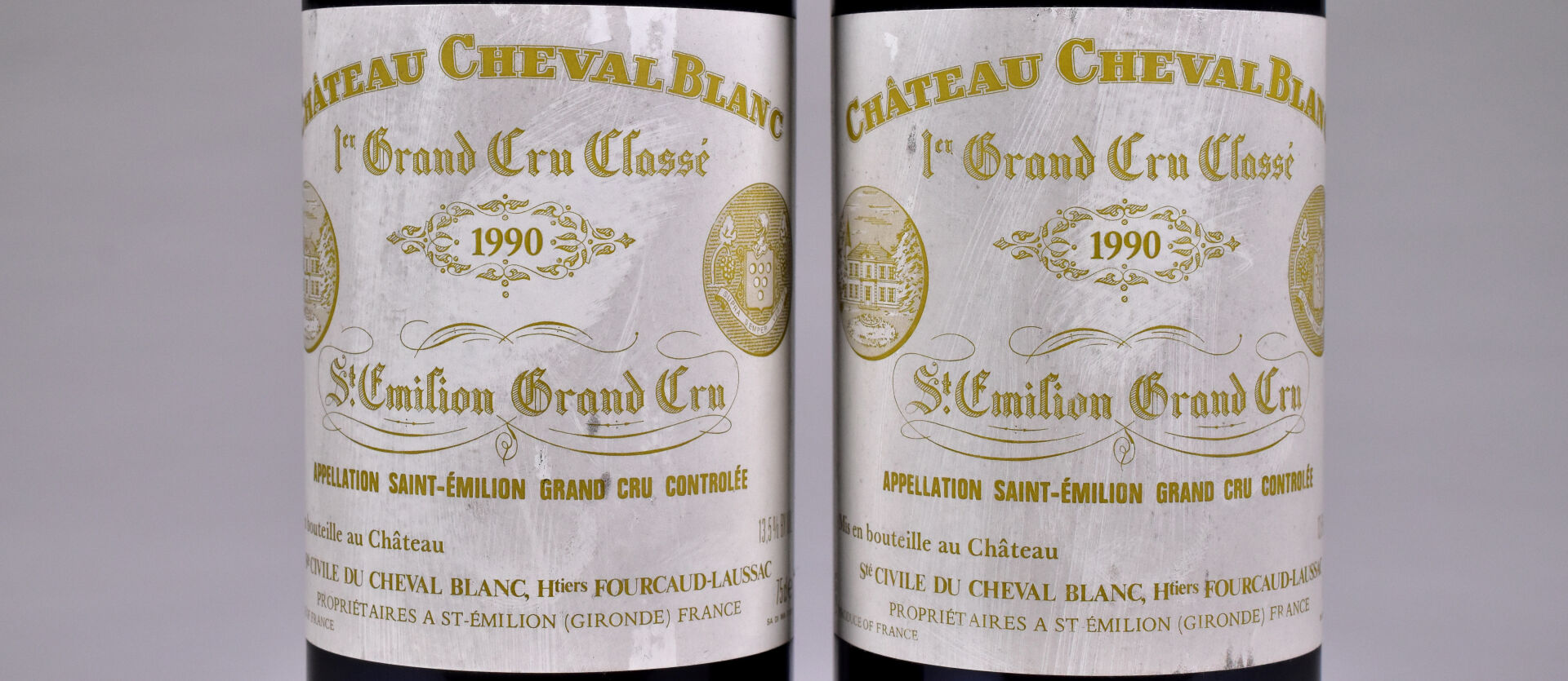 2 bouteilles, Saint-Emilion Grand Cru, Château Cheval Blanc, 1990. Bouchons très légèrement engagés. Capsules sales et abimées en bas de jupe. Étiquettes légèrement sales.
