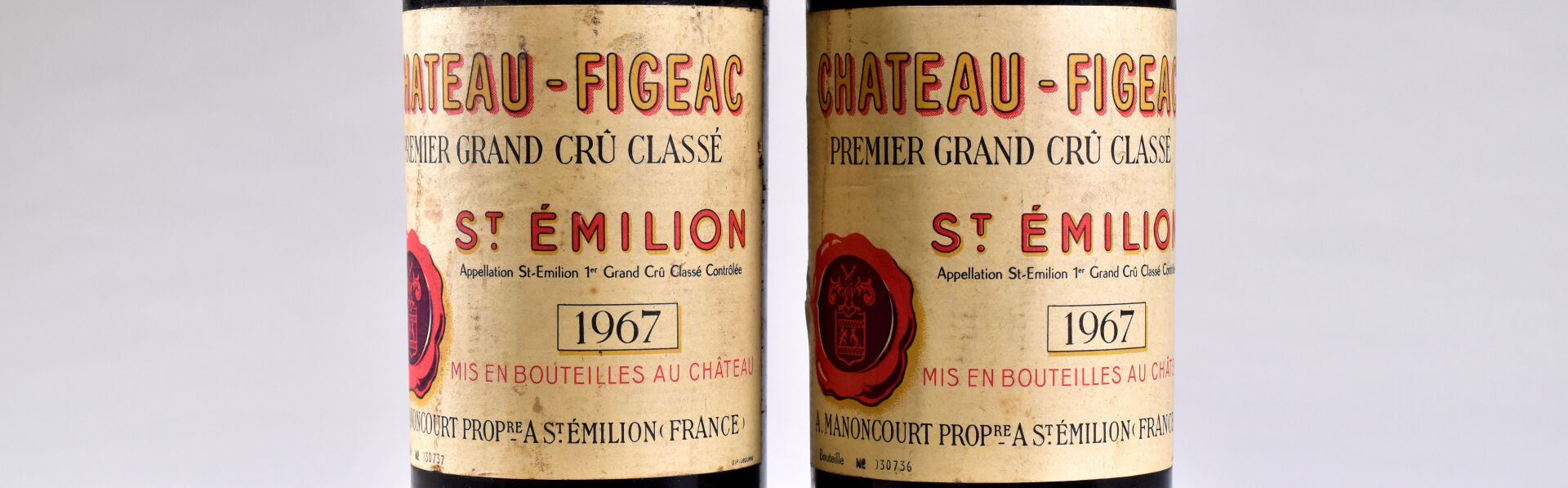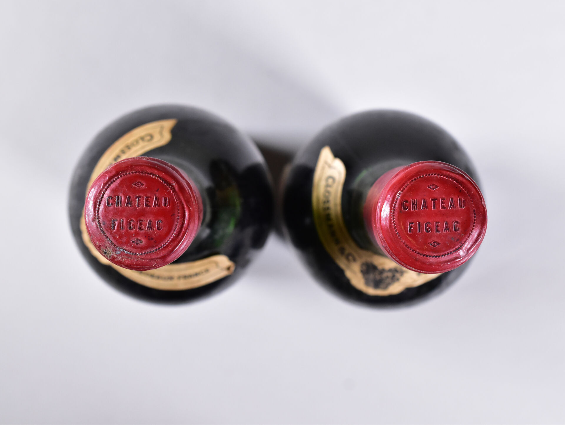 2 bouteilles, Saint-Emilion Grand Cru, Château-Figeac, 1er Grand Cru Classé « A », 1967. 1 TLB et 1 HE (-). Étiquettes fanées et légèrement tachées.