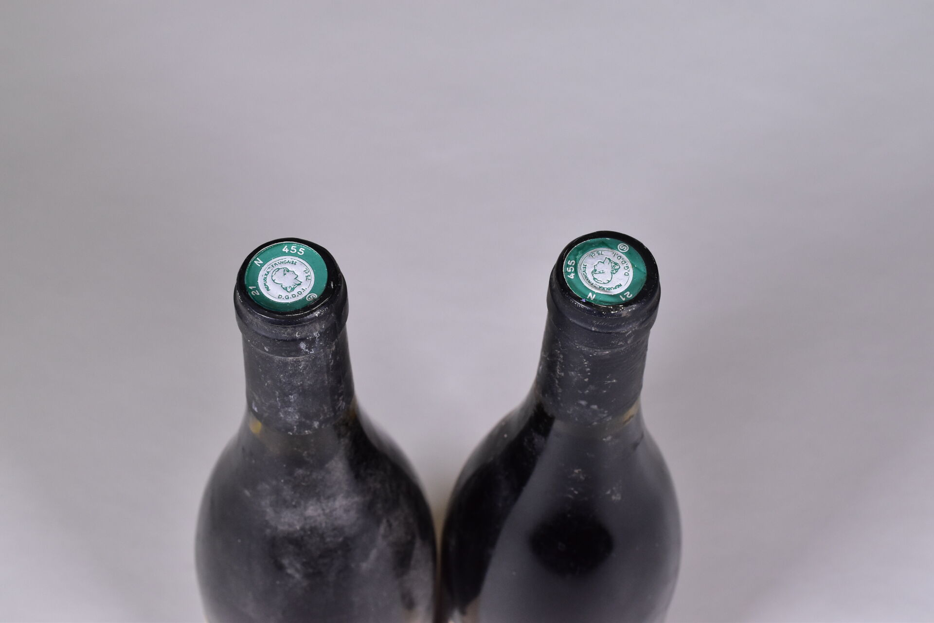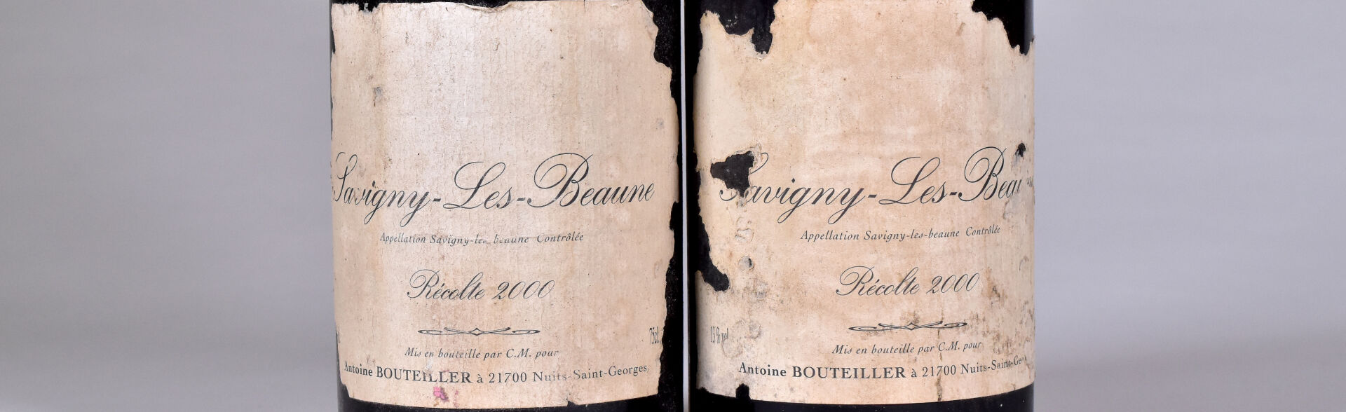 2 bouteilles, Savigny-Les-Beaune, Antoine Bouteiller, 2000. Étiquettes fanées, légèrement sales et dégradées.