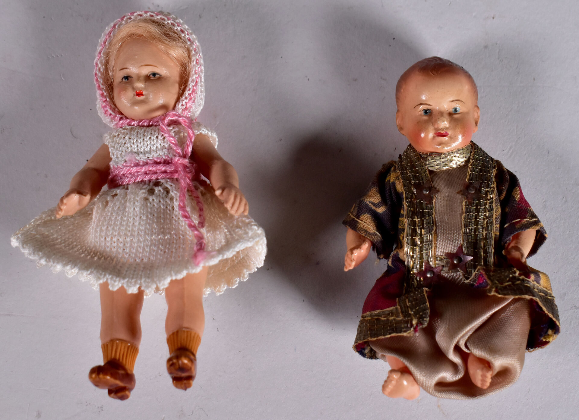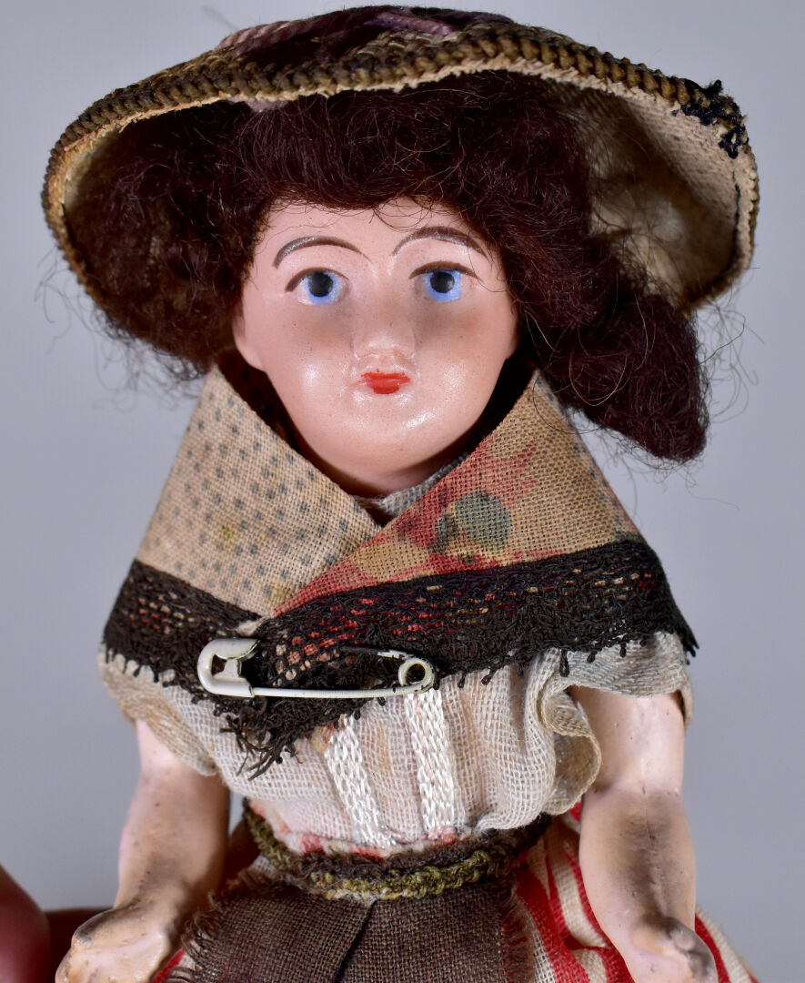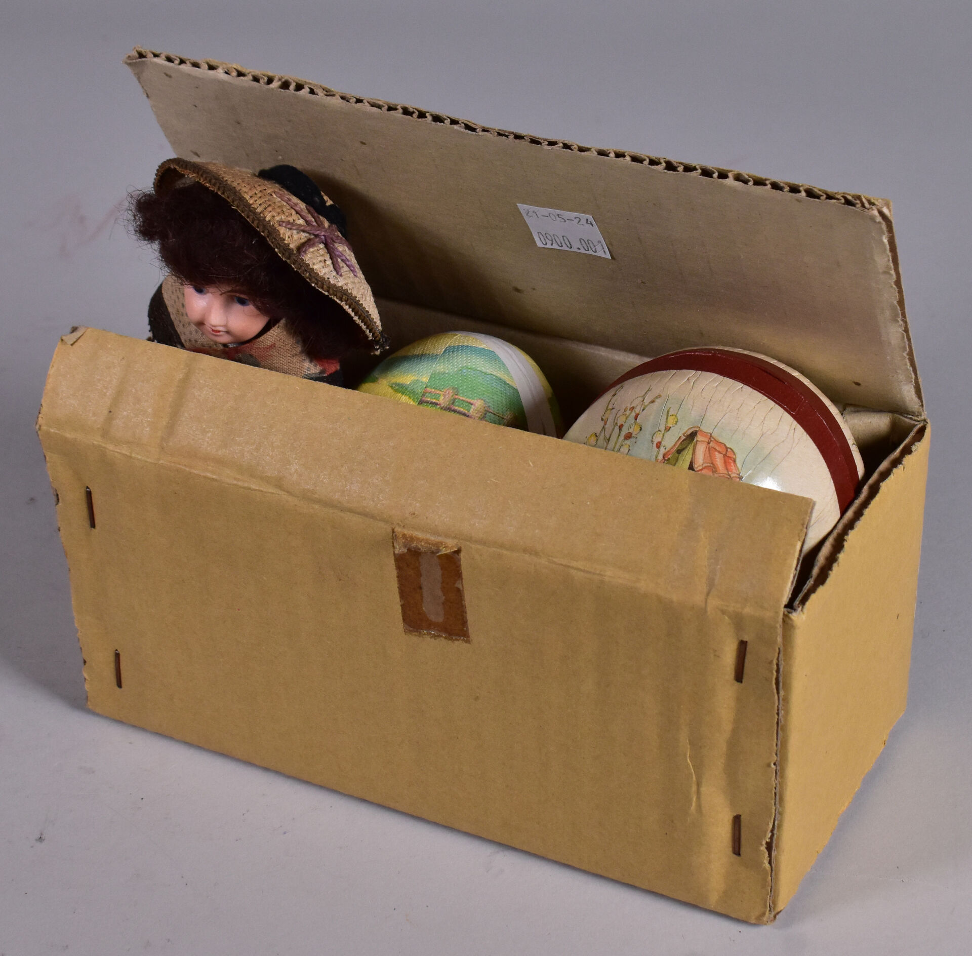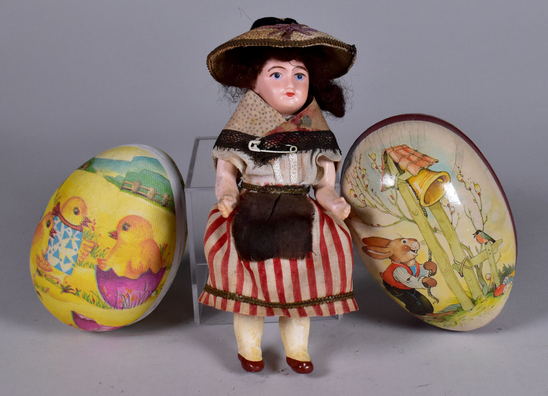 2 œufs de Pâques forment boîte carton 11cm +/- contenant chacun une petite poupée en celluloïd, on y joint une mignonette tête porcelaine Unis France costume régional 16 cm.