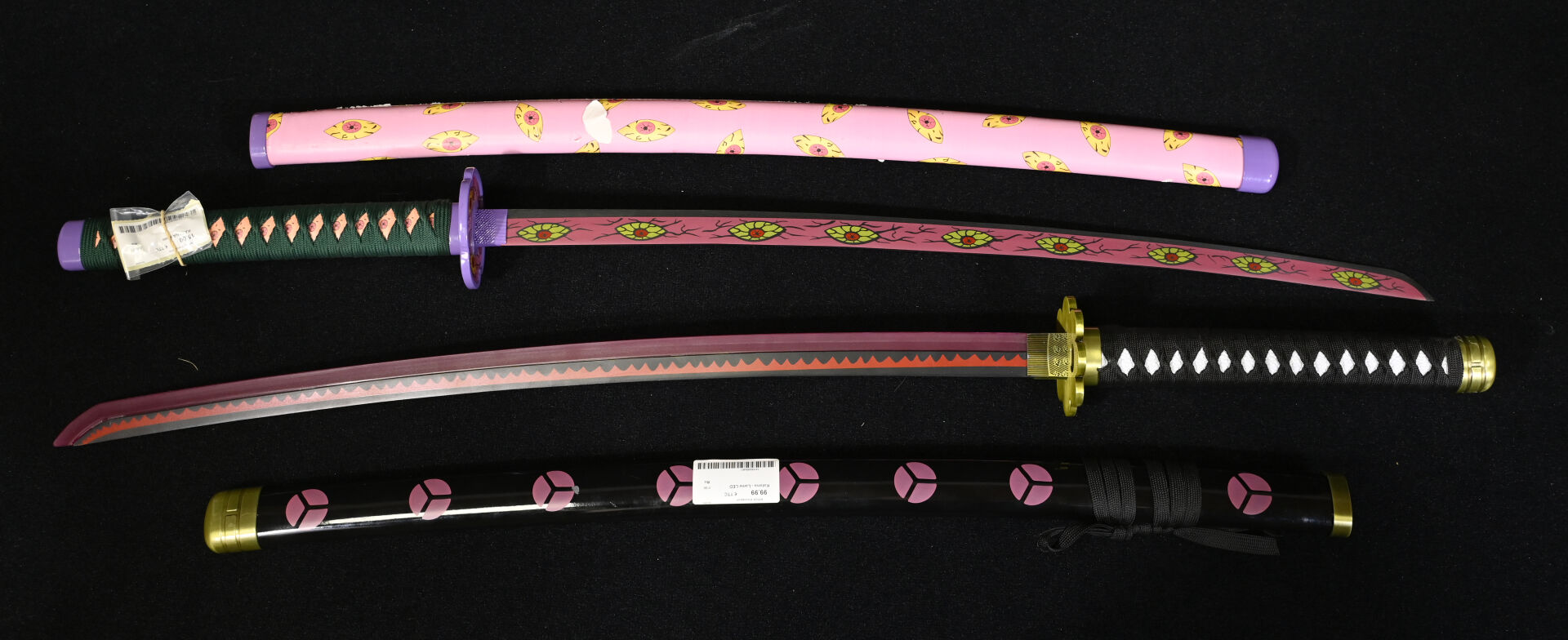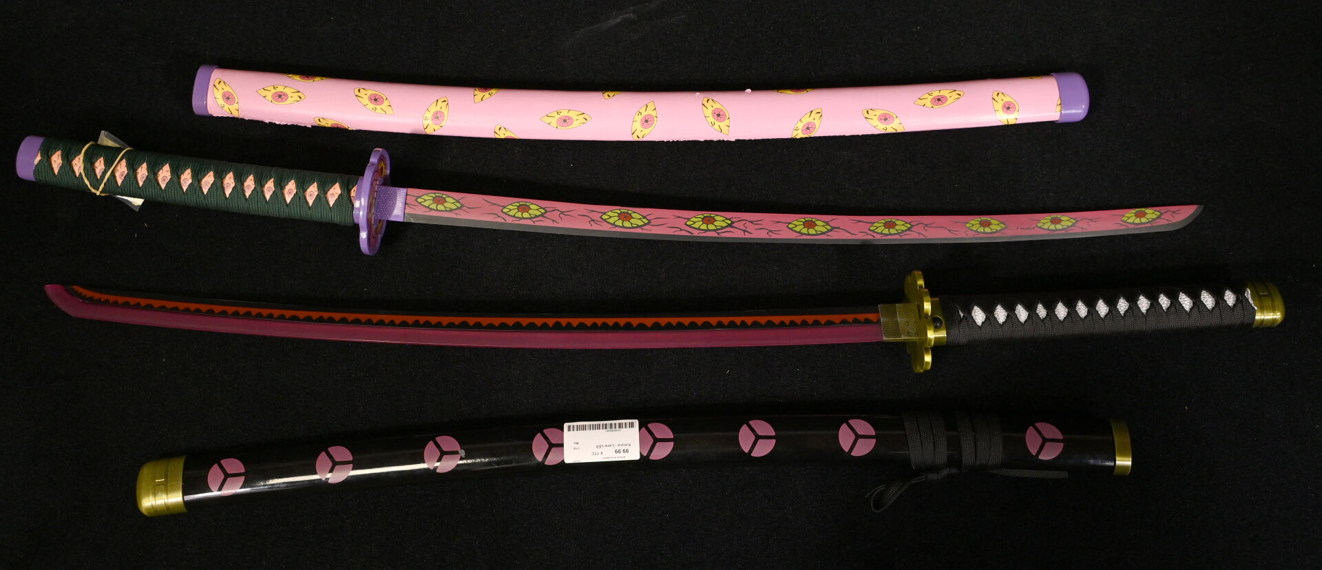 * 2 reproductions de KATANA, dont 1 LED (fonctionnement non garanti) Avec fourreau – états d’usure. Longueur totale : 64cm