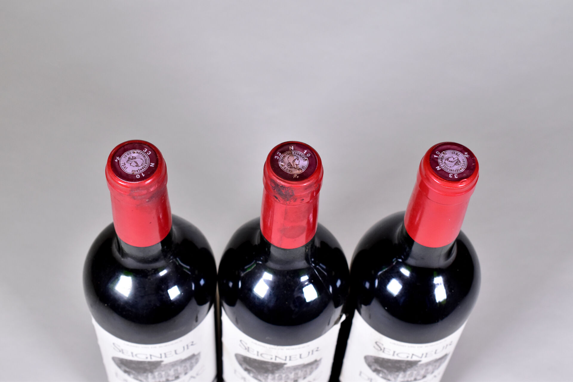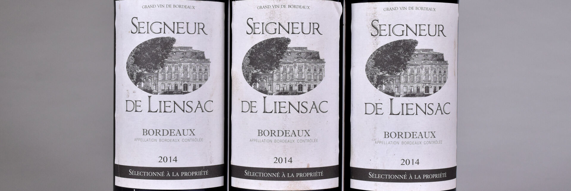3 bouteilles, Bordeaux, Seigneur de Liensac, 2014. Deux capsules légèrement sales, et quelques traces sur les étiquettes.
