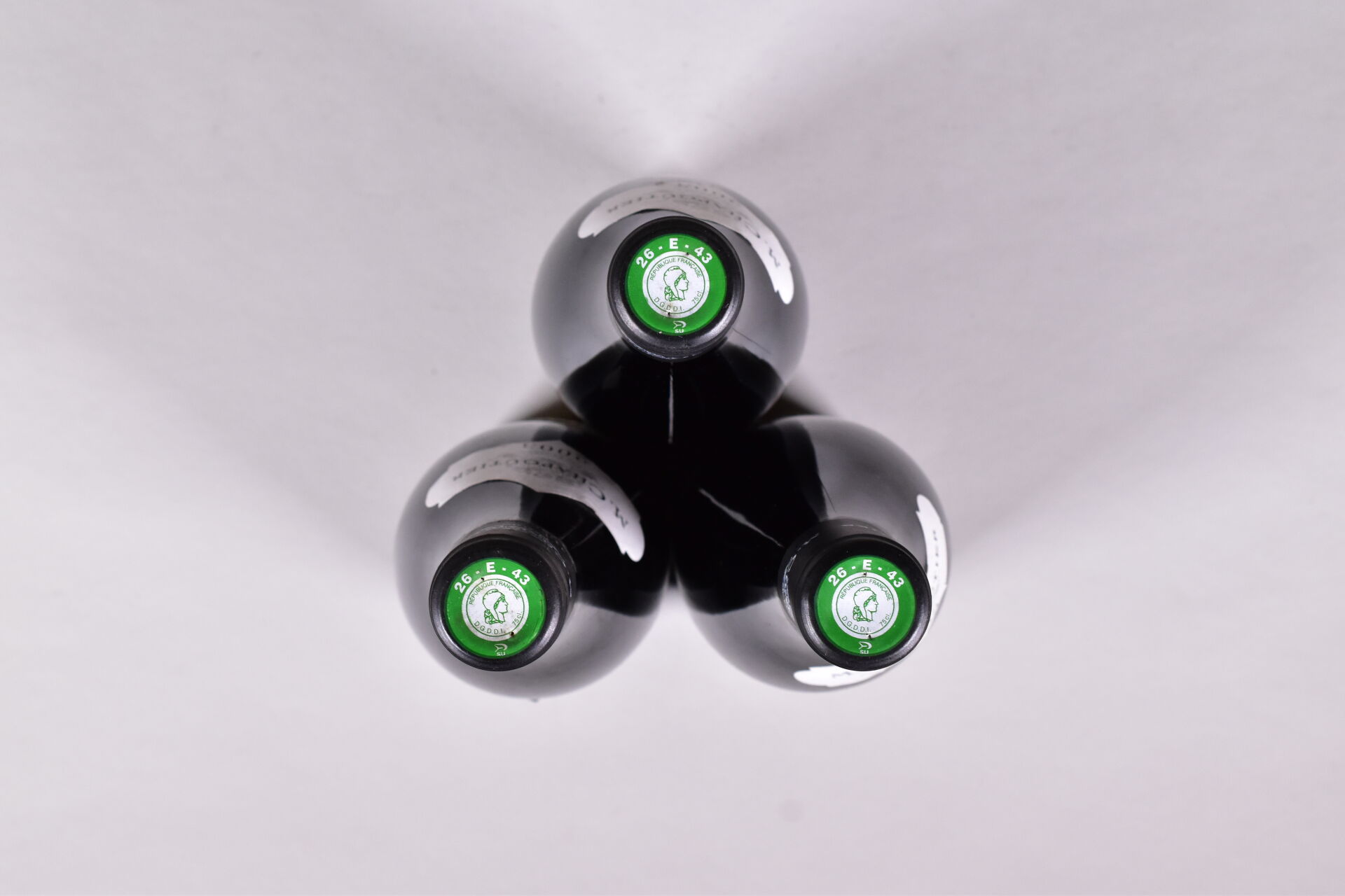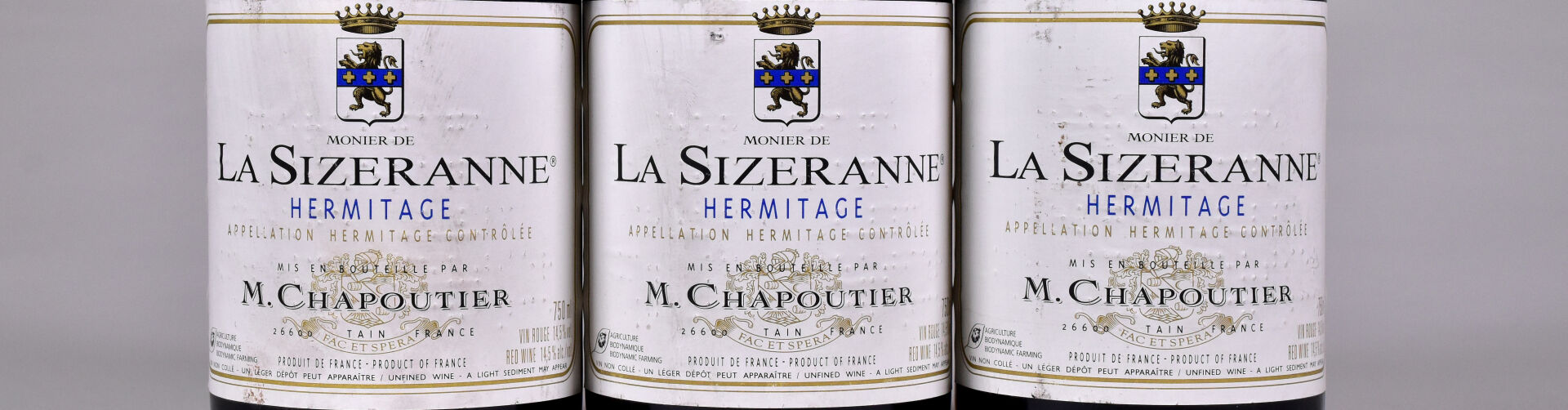 3 bouteilles, Hermitage, Chapoutier, Monier de la Sizeranne, 2003. Étiquettes avec de petites traces, et quelques petits points de décollement.