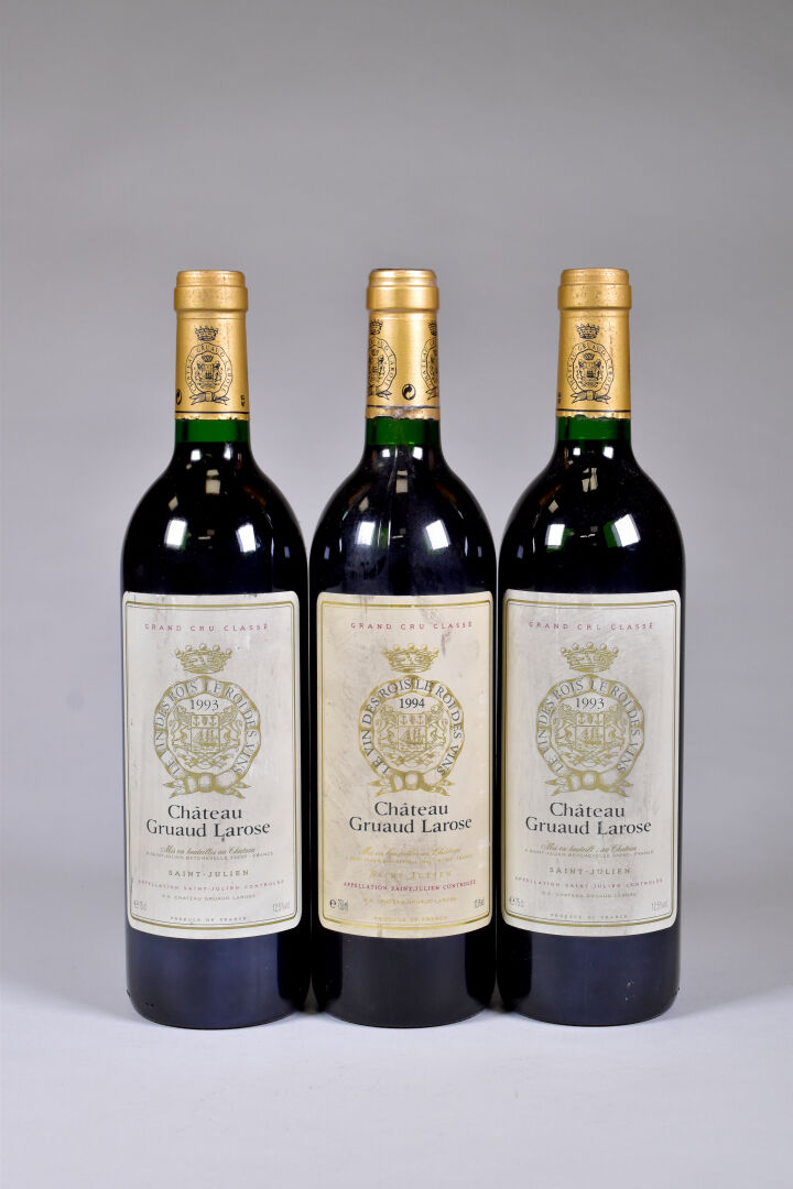 3 bouteilles, Saint-Julien, Château Gruaud Larose, 2ème Grand Cru Classé, 1993 (2), 1994 (1). Capsules légèrement abimées en bas de jupe. Étiquettes sales.