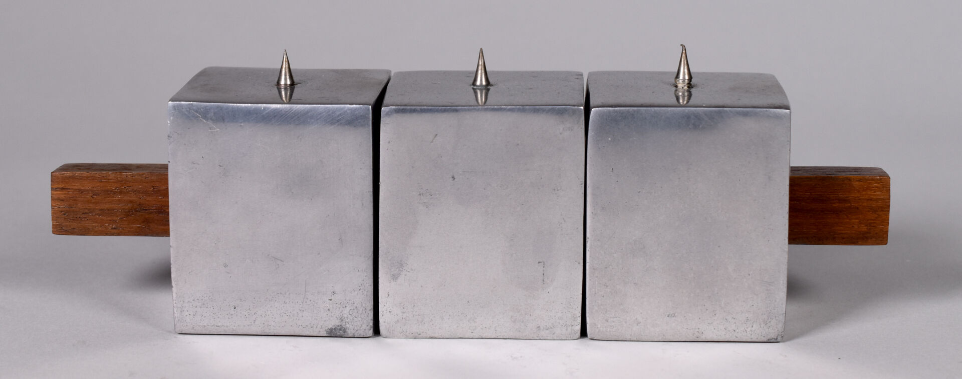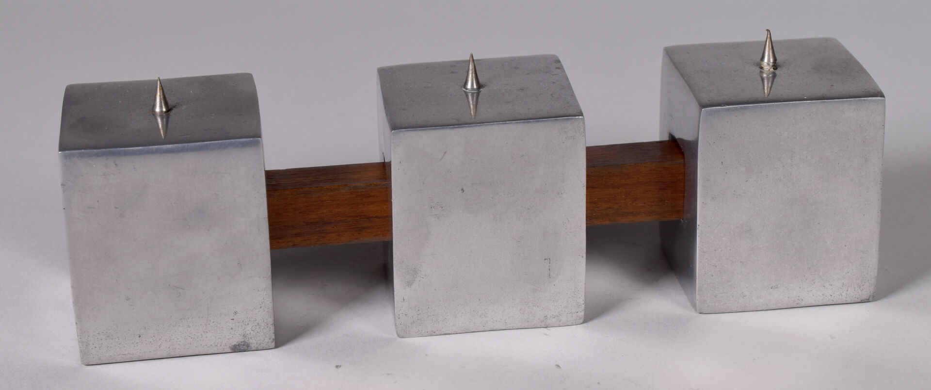 3 pique-cierges cubiques en métal, coulissants sur une tige de noyer. Travail dans le goût scandinave du milieu du XXe siècle. Haut. : 8 cm.