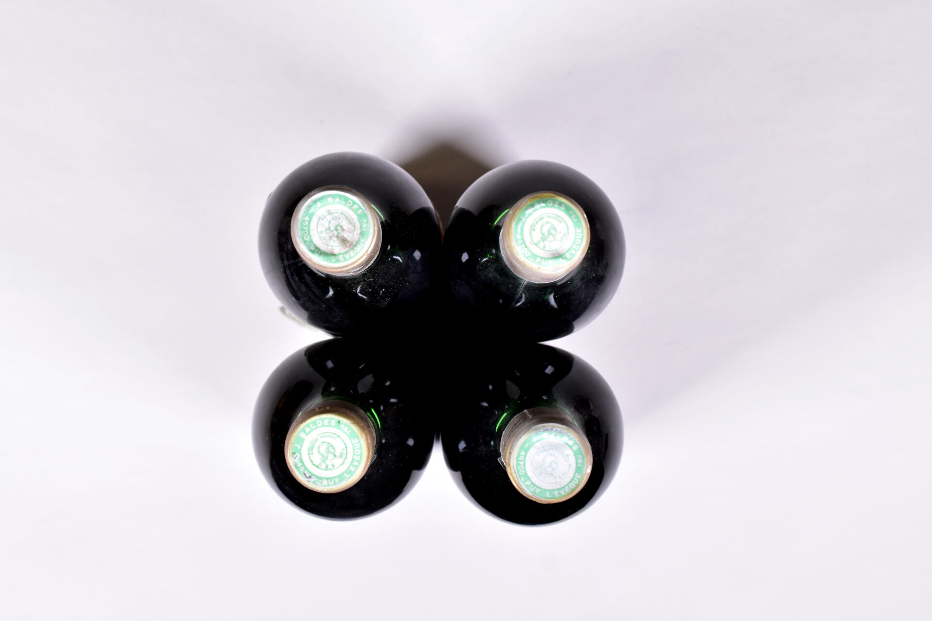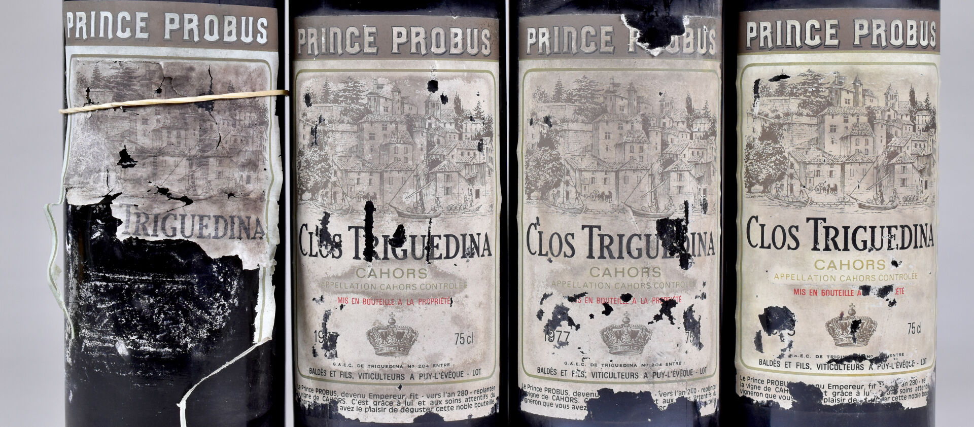 4 bouteilles, Cahors, Clos Triguedina, Prince Probus, 1977 (2), 2 millésimes illisibles. 3 TLB et 1 HE. Capsules légèrement sales. Étiquettes sales et dégradées à très dégradées, dont 1 est également décollée.