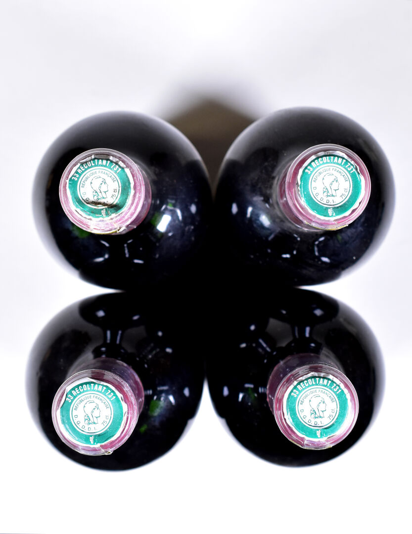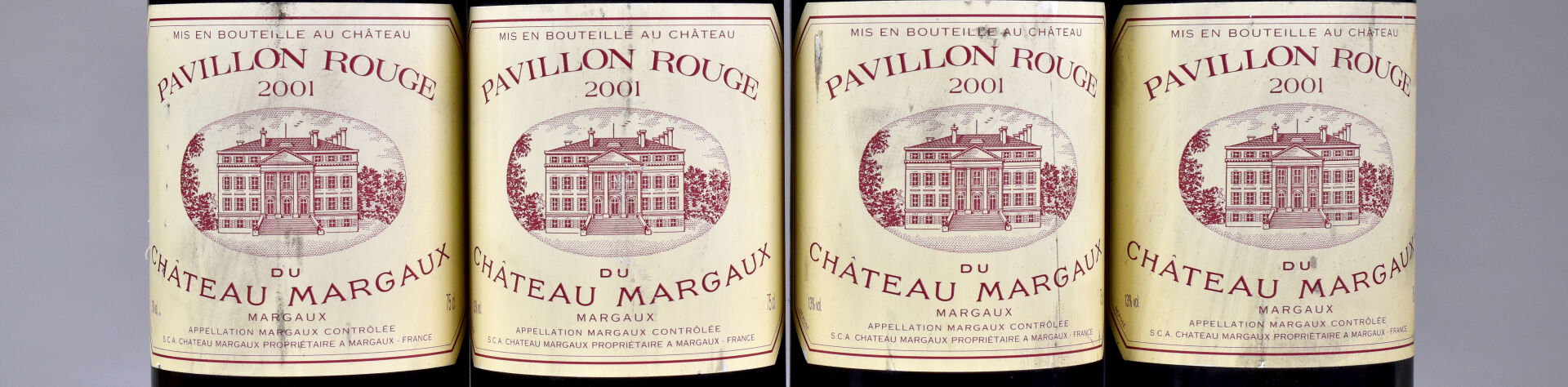 4 bouteilles, Margaux, Pavillon Rouge (second vin du Château Margaux), 2001. 1 BG+. Capsules légèrement sales et abimées en bas de jupe. Étiquettes légèrement sales et avec des traces.