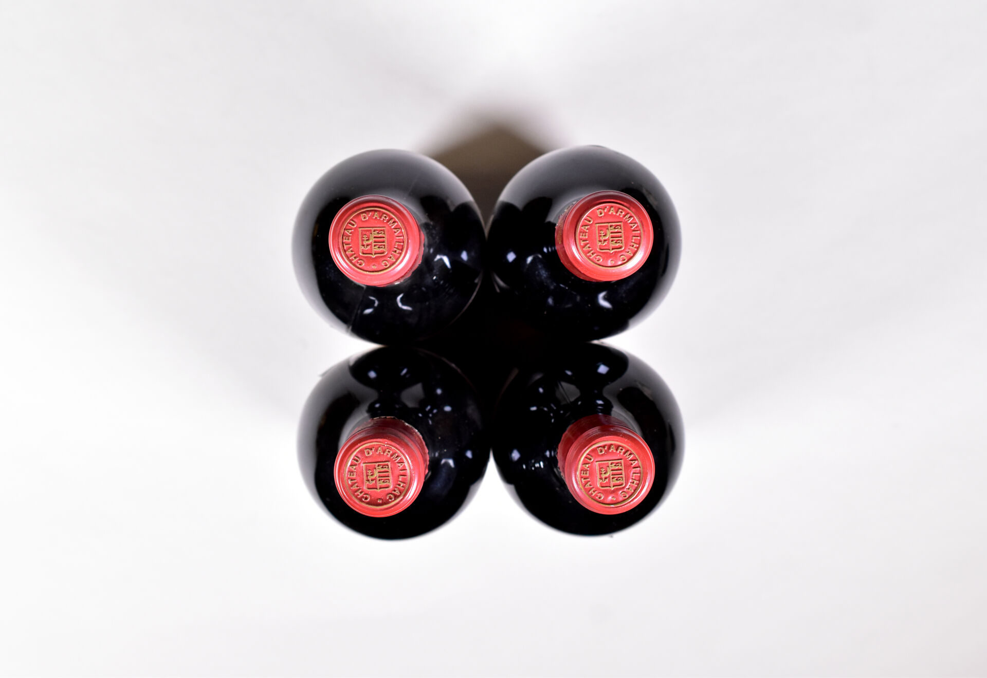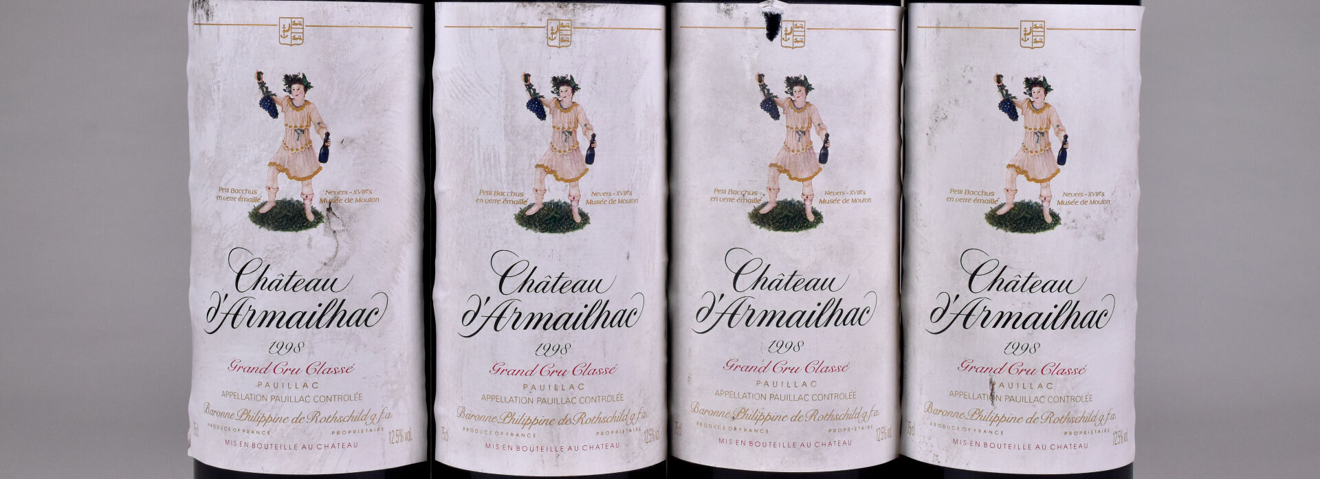 4 bouteilles, Pauillac, Château d’Armailhac, 5ème Grand Cru Classé, 1998. Capsules légèrement abimées en bas de jupe. Étiquettes légèrement sales, avec des petits points de décollement. Une étiquette présente également une petite déchirure.