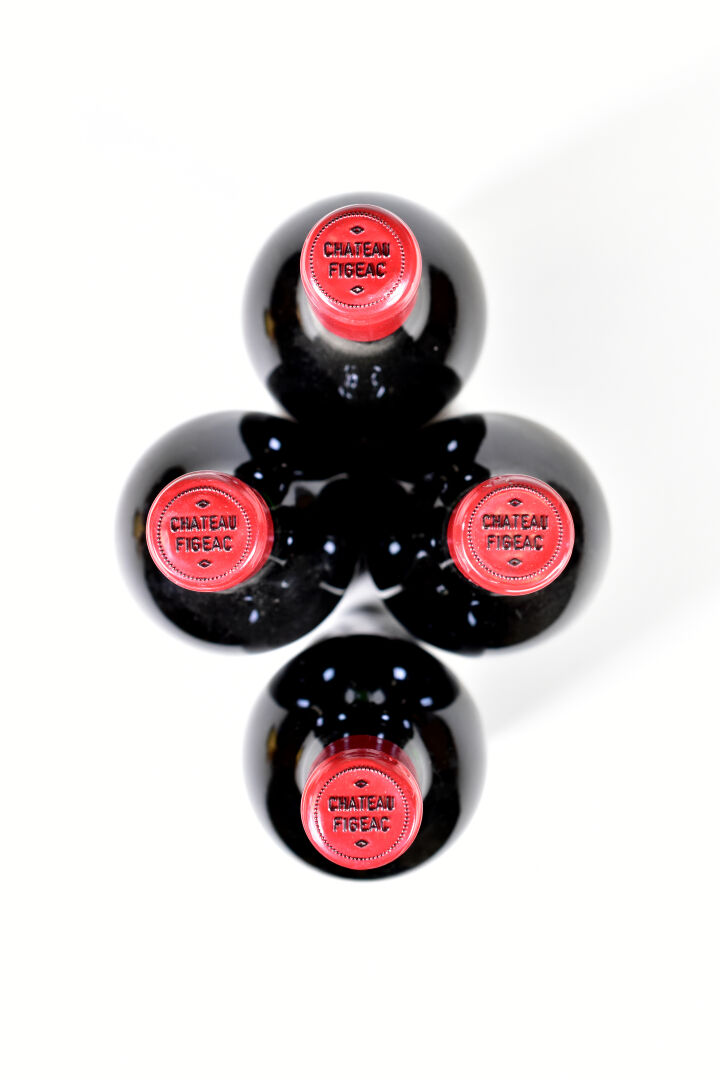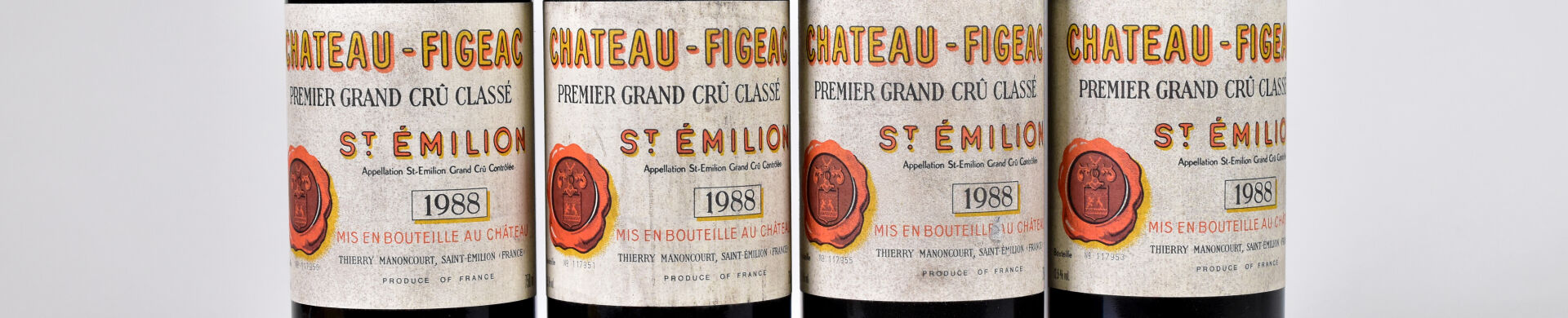 4 bouteilles, Saint-Emilion Grand Cru, Château Figeac, 1er Grand Cru Classé ‘A’, 1988. 2 BG+, 1 BG et 1 TLB. Étiquettes grisées et avec des traces. Une étiquette présente également une petite marque.