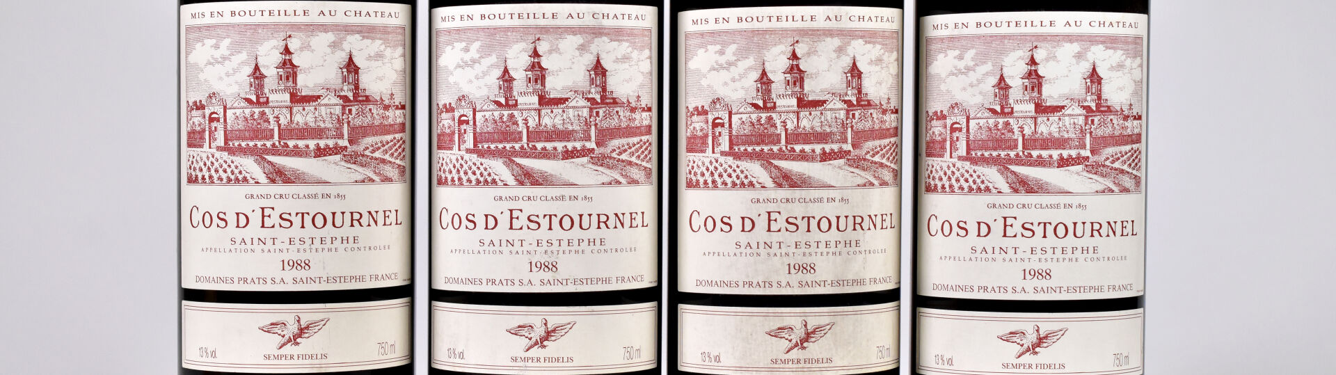 4 bouteilles, Saint-Estèphe, Cos d’Estournel, 2ème Grand Cru Classé, 1988. Une étiquette avec de légères traces.