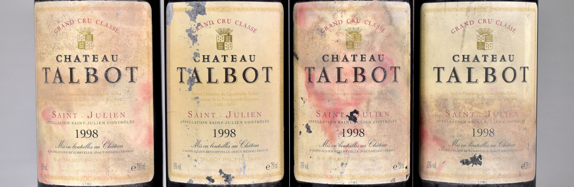 4 bouteilles, Saint-Julien, Château Talbot, 4ème Grand Cru Classé, 1998. Capsules légèrement sales et abimées en bas de jupe. Étiquettes sales et abimées.