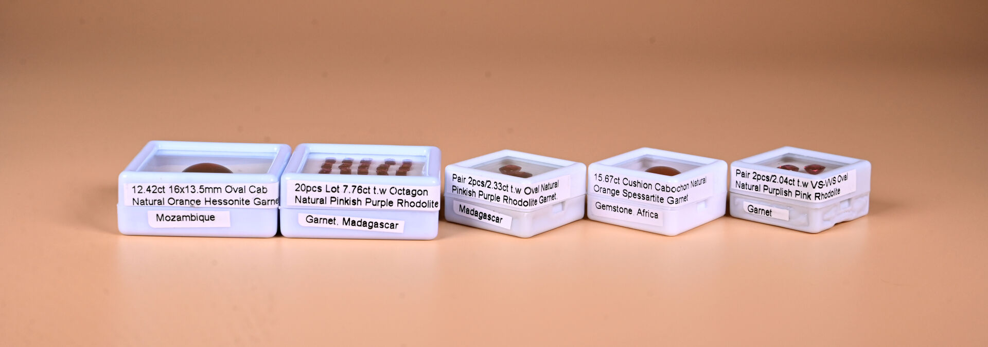 4 grenats sur papier ovales (hodolite), 2 cabochons de grenats (spéssartite et héssonites) frottées. On joint 2 petits grenats rodolites.