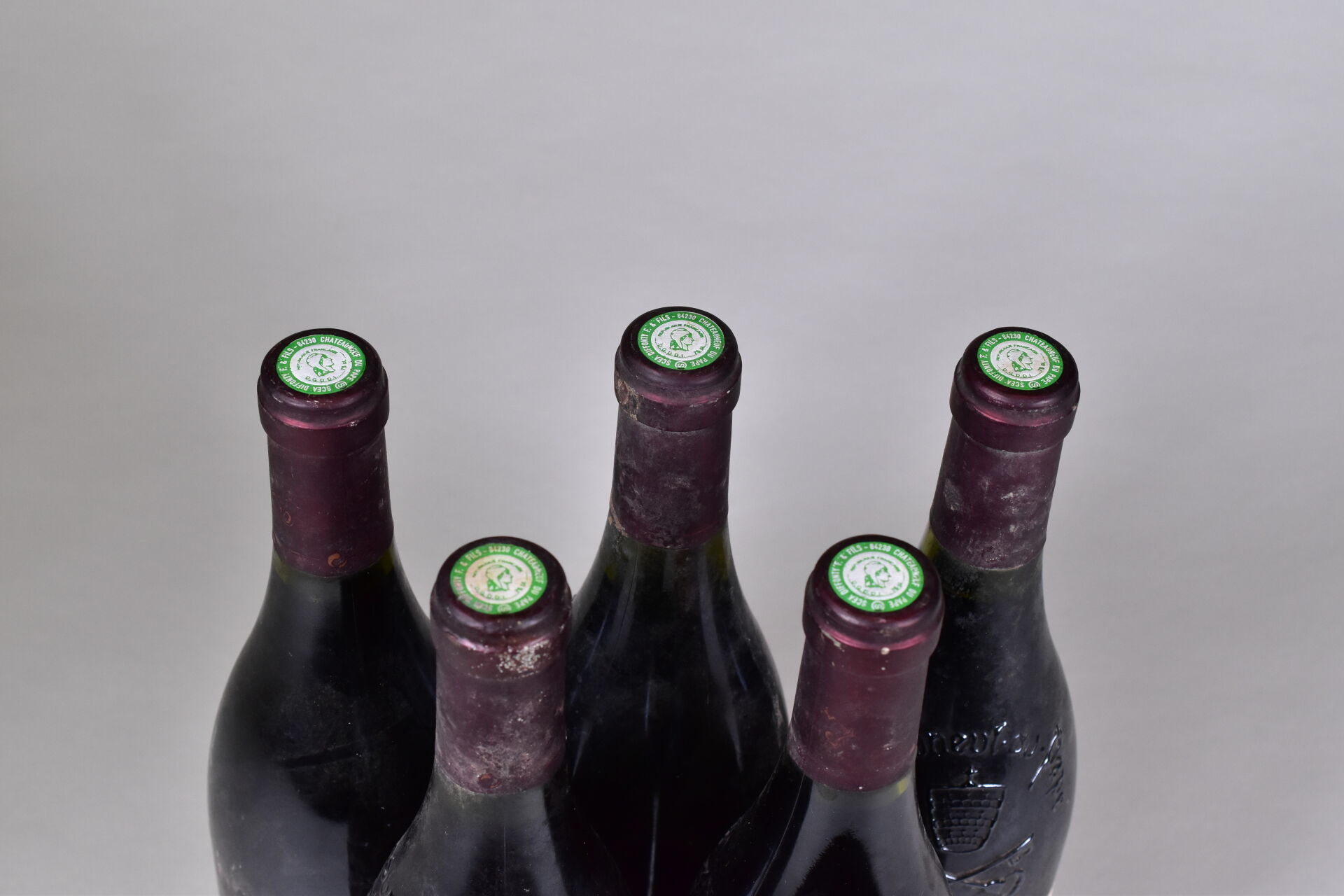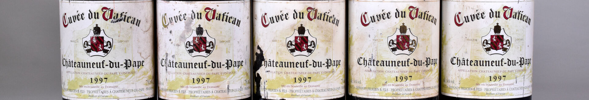 5 bouteilles, Châteauneuf-du-Pape, Diffonty Félicien et Fils, Cuvée du Vatican, 1997. Capsules sales. Étiquettes sales, dont une est partiellement dégradée.