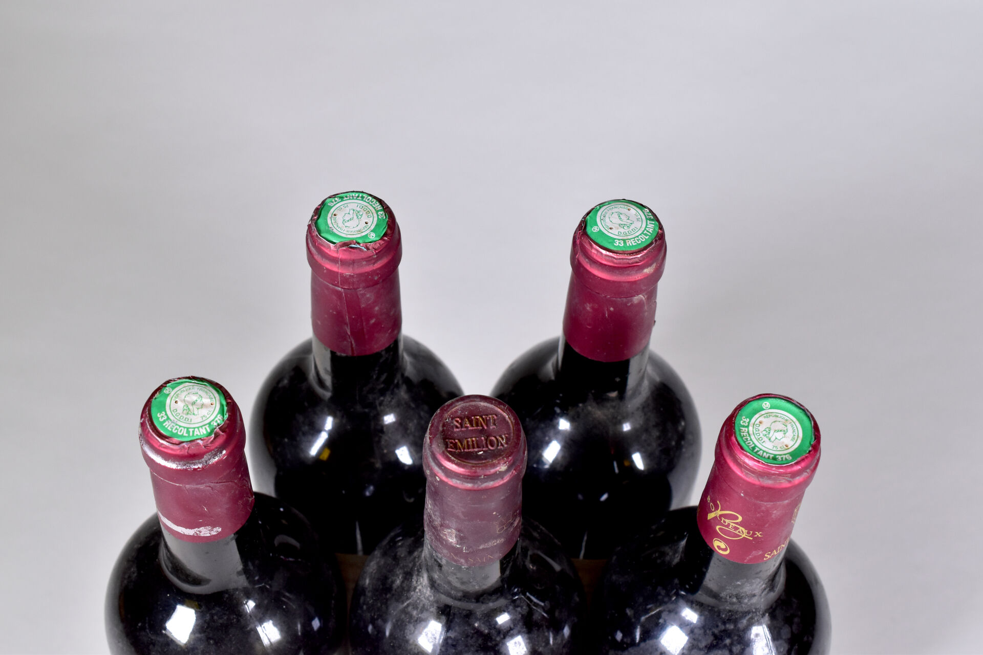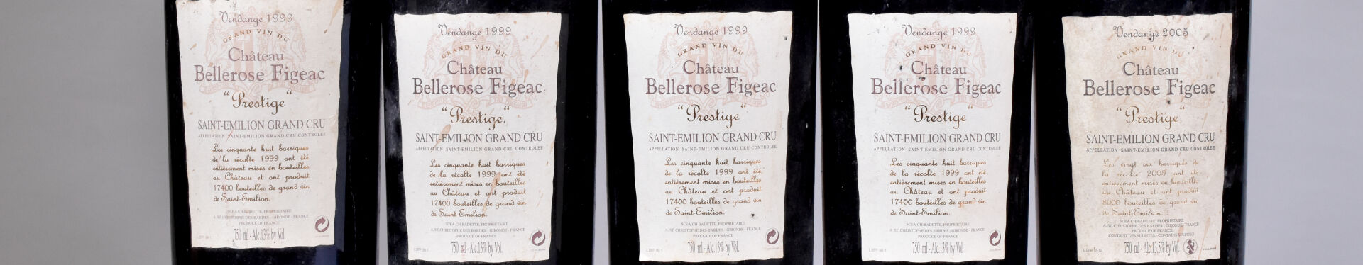 5 bouteilles, Saint-Emilion Grand Cru, Château Bellerose Figeac, Prestige, 1999 (4), 2005 (1). 4 BG+. Capsules légèrement sales. Étiquettes avec de petites taches.