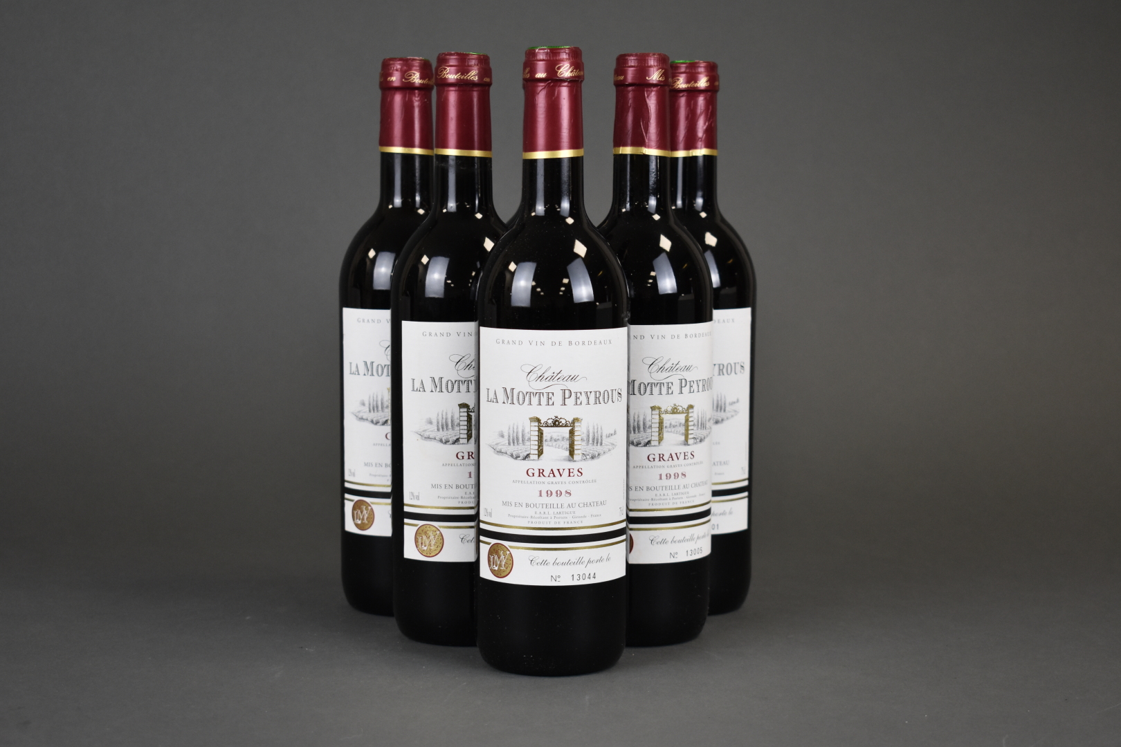 6 Bouteilles CHATEAU LA MOTTE PEYROUS Graves 1998 (étiquettes tachées, une décolée).