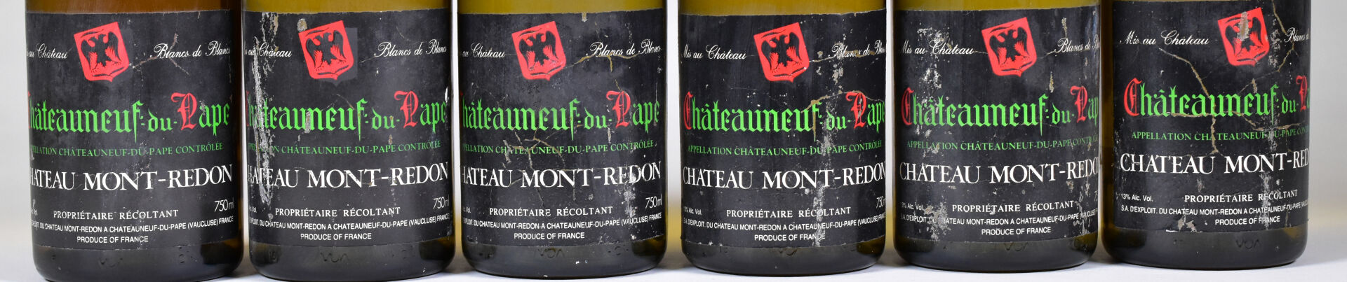 6 bouteilles, Châteauneuf-du-Pape (blanc), Château Mont Redon, 1992. 2 niveaux à 3 centimètres. Des capsules légèrement abimées en bas de jupe. Collerettes et étiquettes légèrement sales, dont certaines sont également dégradées.