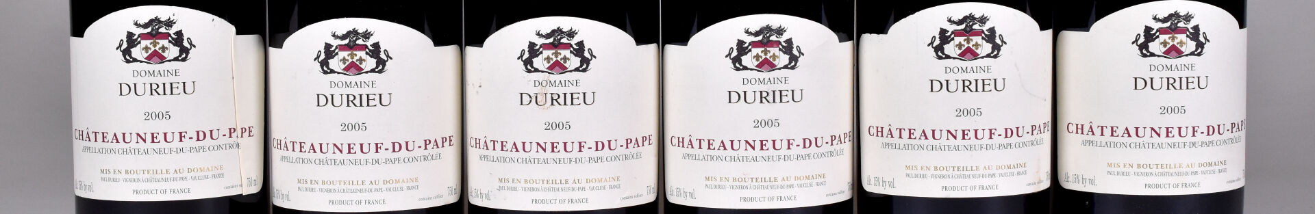 6 bouteilles, Châteauneuf-du-Pape, Domaine Durieu, 2005. Deux étiquettes avec de légères traces. Une étiquette avec un pli.
