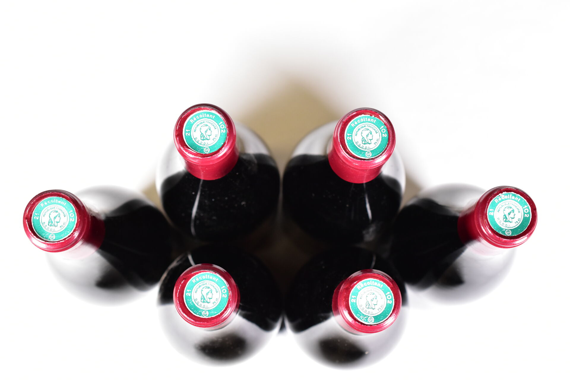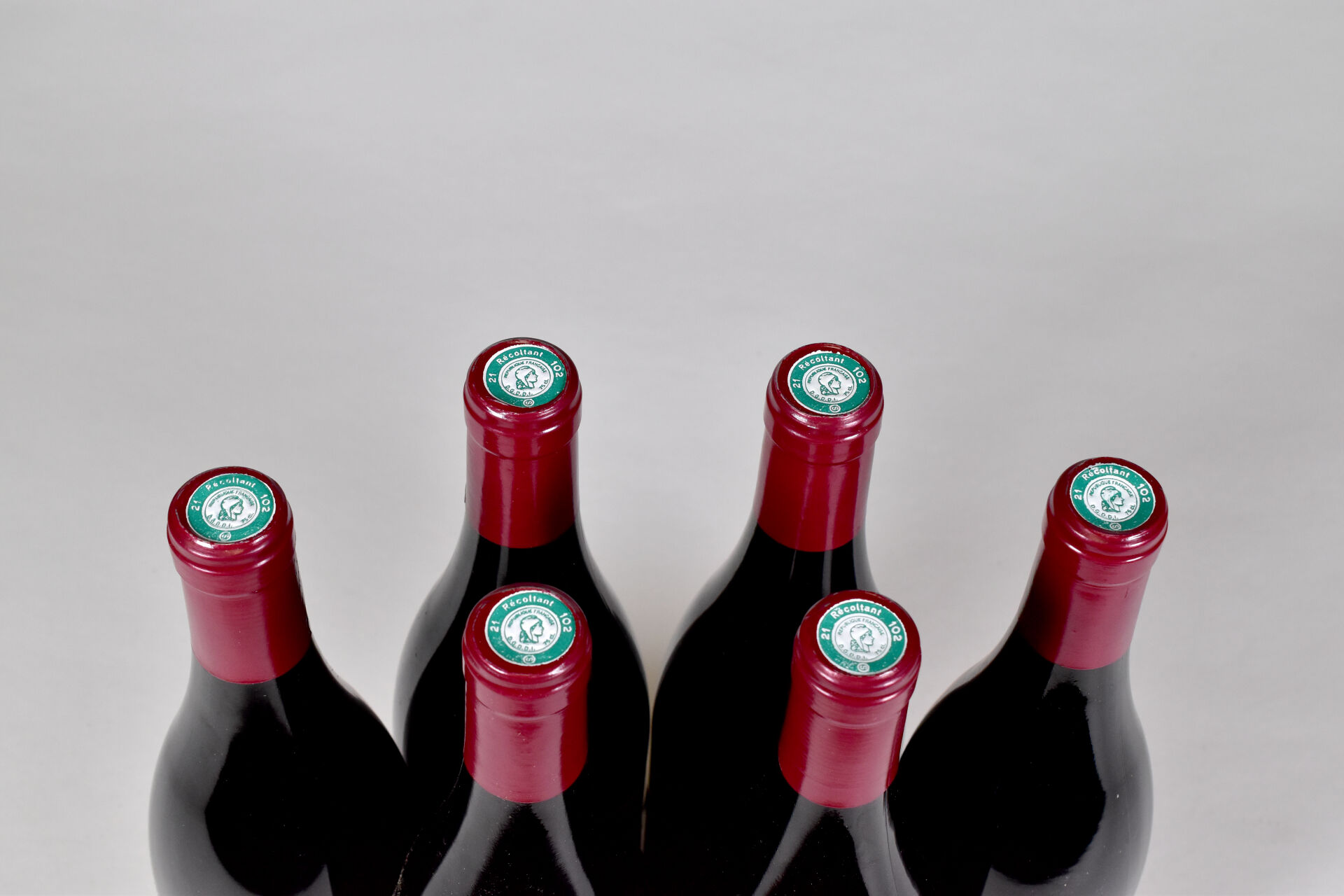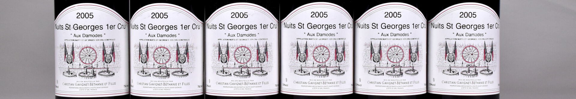 6 bouteilles, Nuits Saint-Georges, 1er Cru, « Aux Damodes », 2005. Trois étiquettes avec de petits plis.