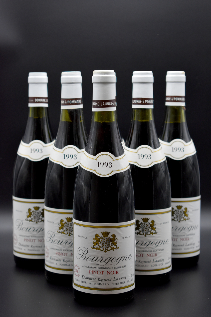6 bouteilles pinot noir DOMAINE RAYMOND LAUNAY, Bourgogne, 1993 (bons niveaux). Carton.