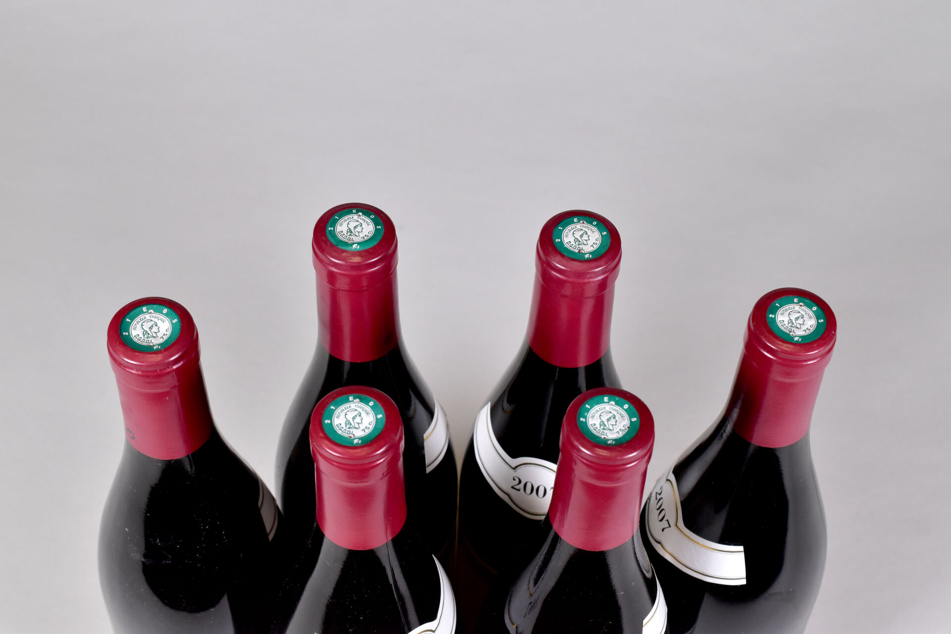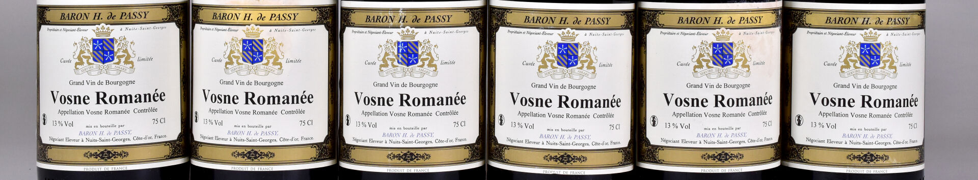 6 bouteilles, Vosne-Romanée, Baron H. de Passy, 2007. Étiquettes avec de petits plis. Deux étiquettes avec de légères traces.