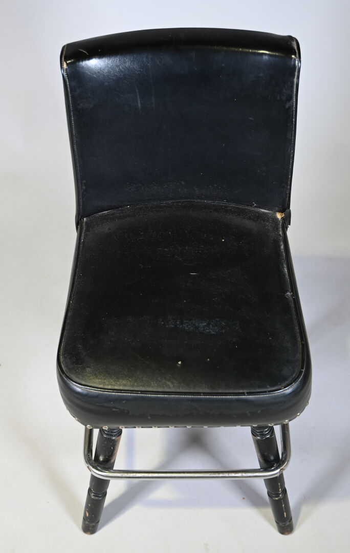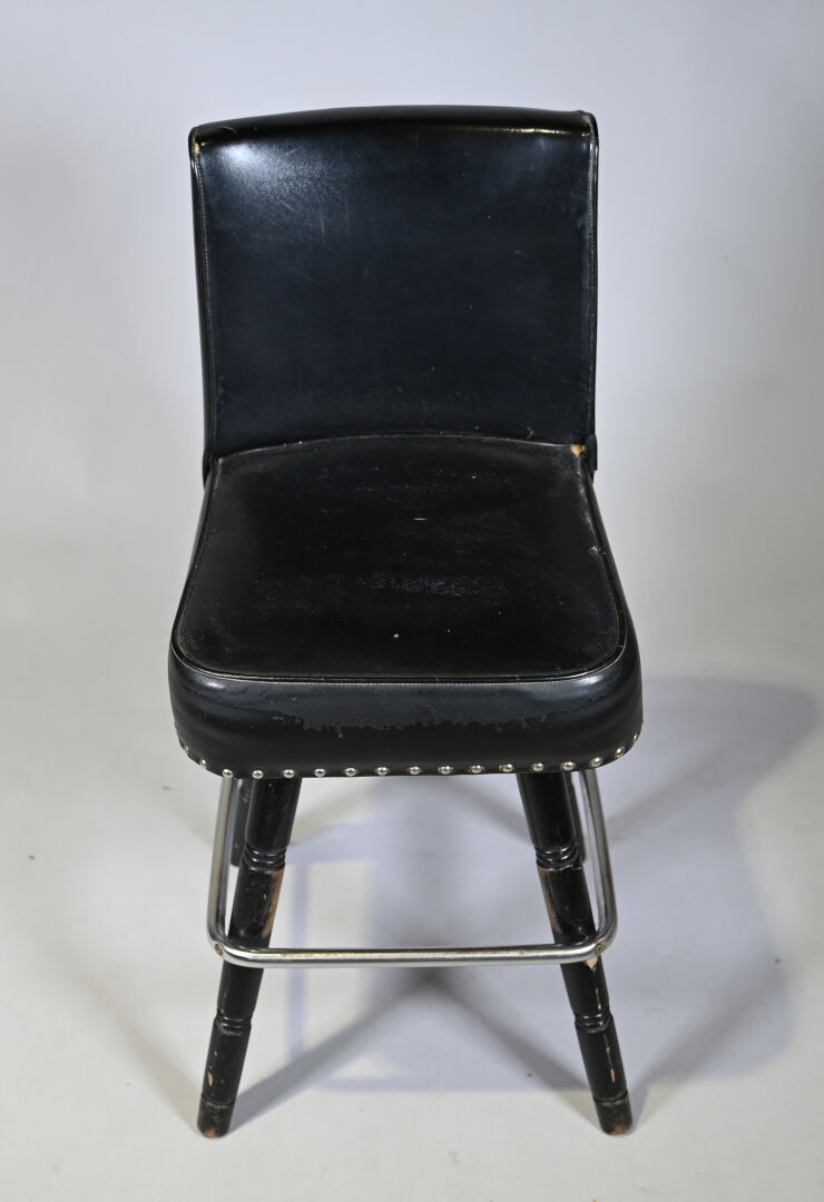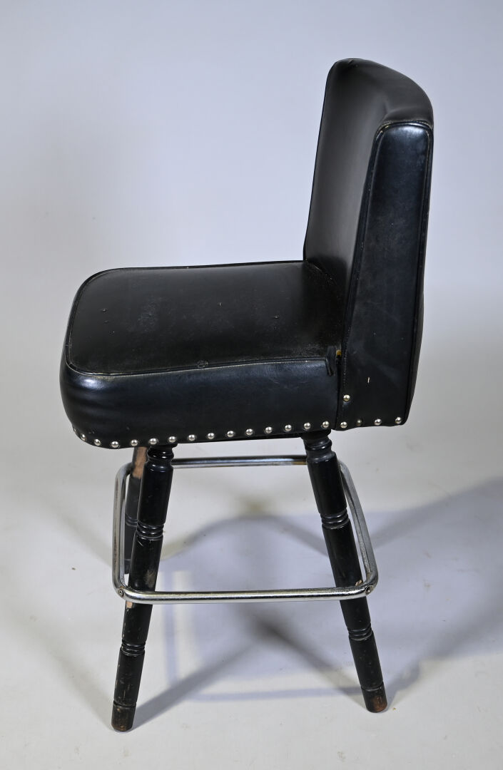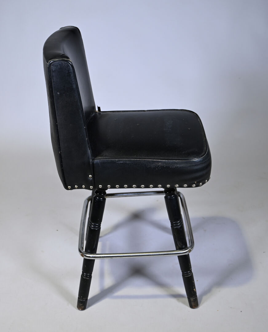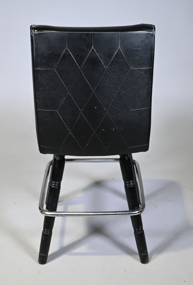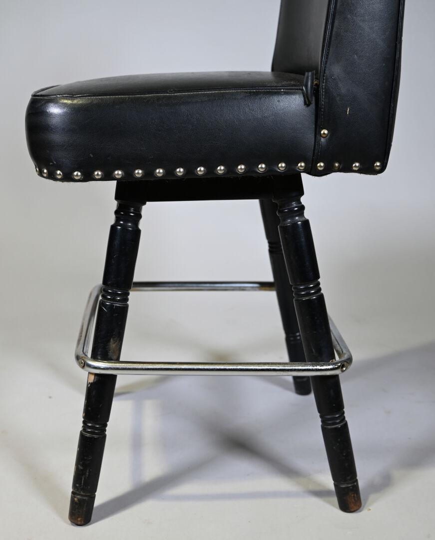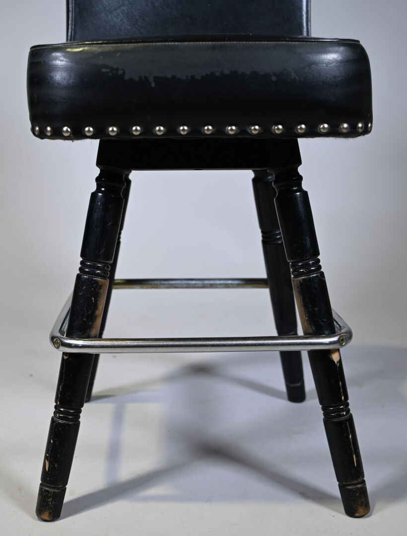 8 Chaises de bar en bois tourné laqué noir et métal, garniture de skaï noir clouté. Milieu du XXe siècle. Haut. : de 90,5 à 95 cm.