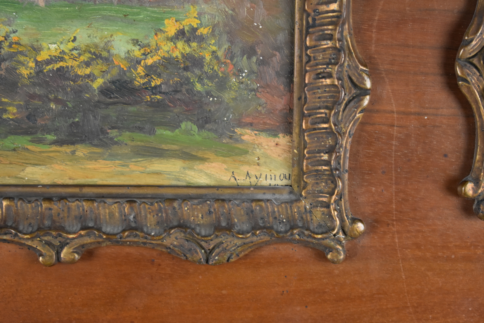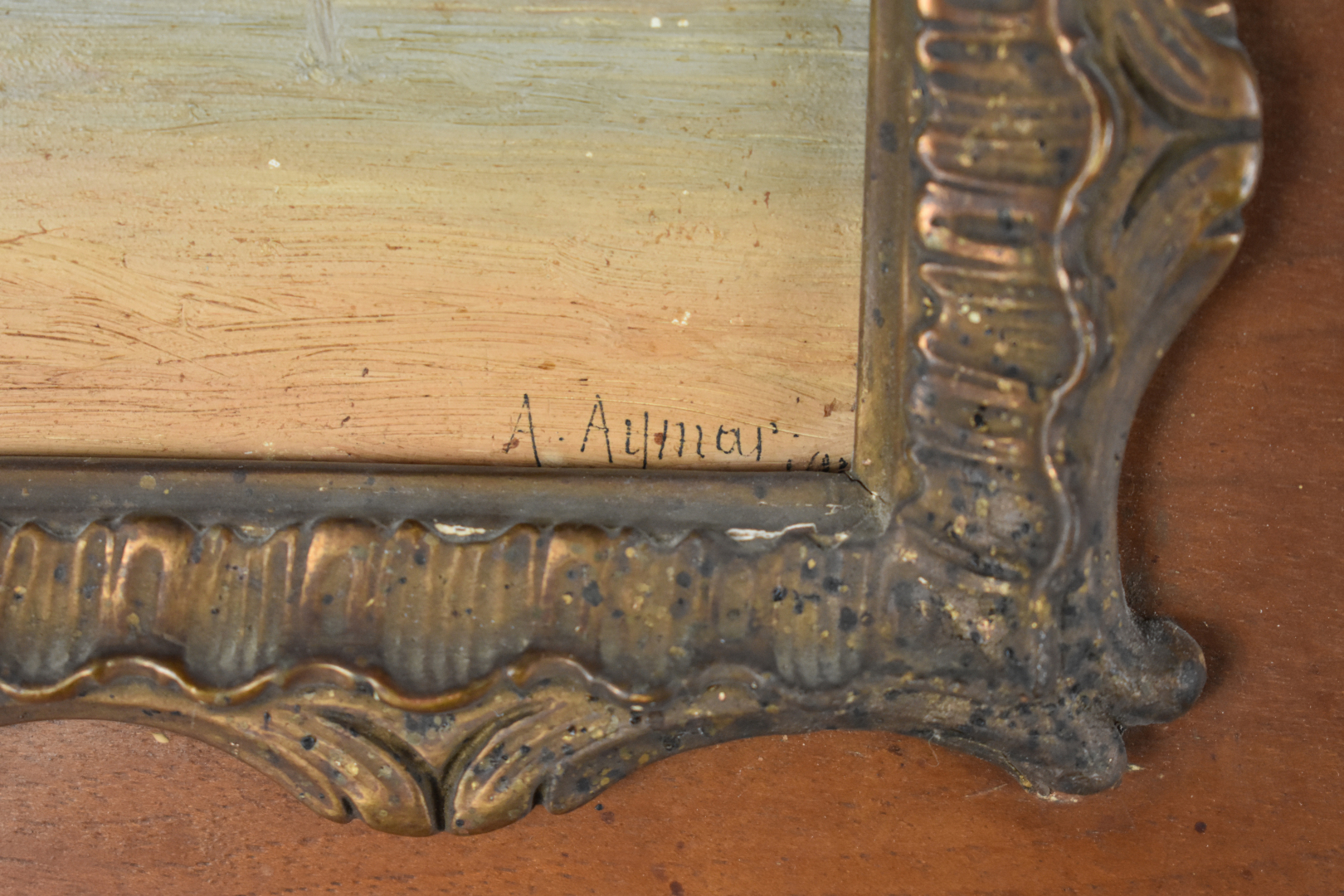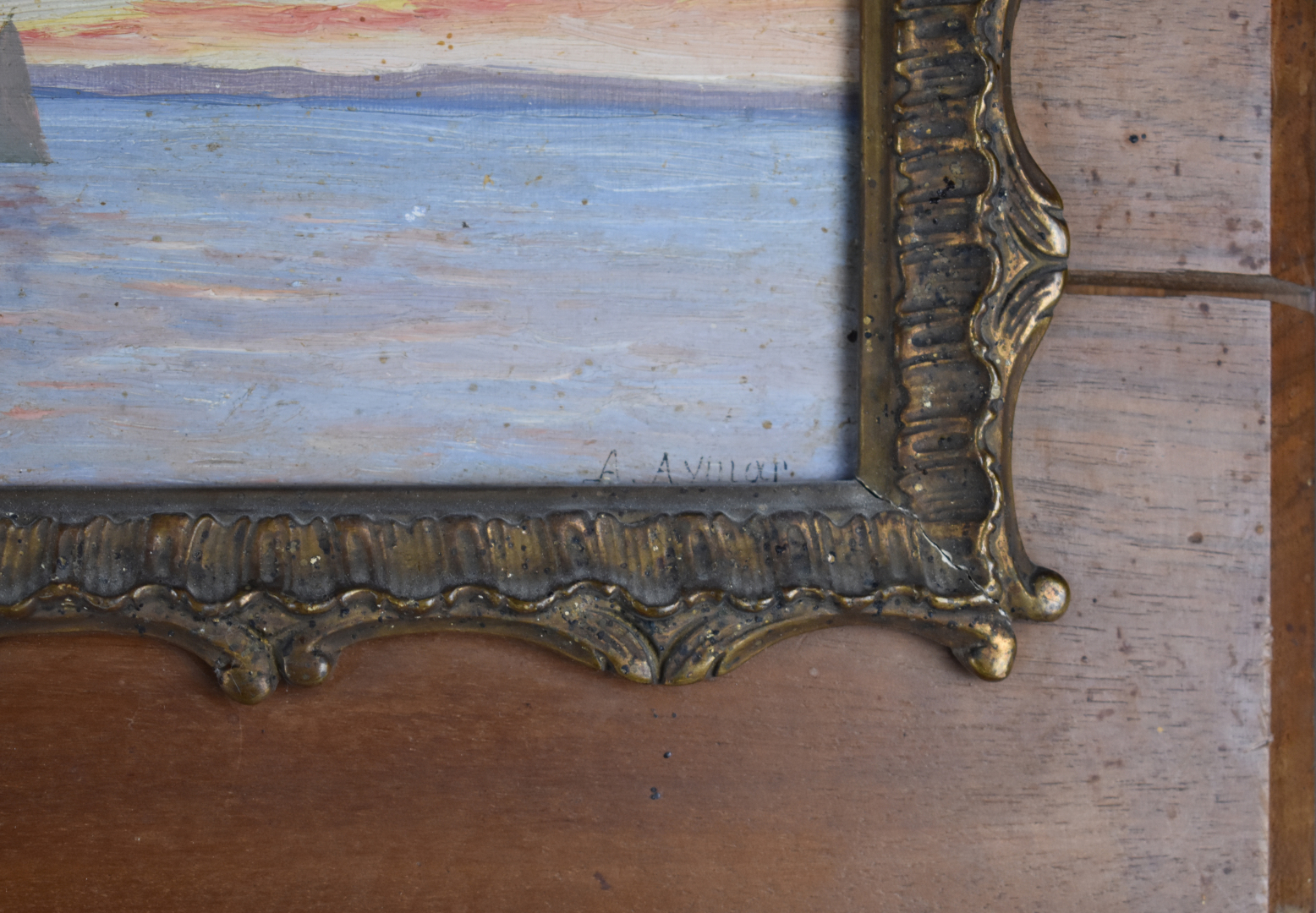 A. AYMAR (XIXe-XXe siècle). La plage, Paysage de campagne et Coucher de soleil sur l’eau. Trois huiles, deux sur panneaux et la dernière sur carton, montées dans un seul cadre (fente) en triptyque. Signées et datée 1912. Dim. d’un panneau : 19 x 24 cm.