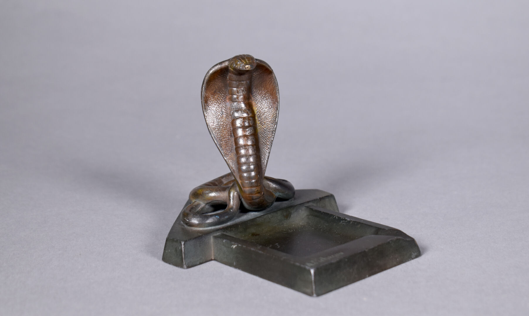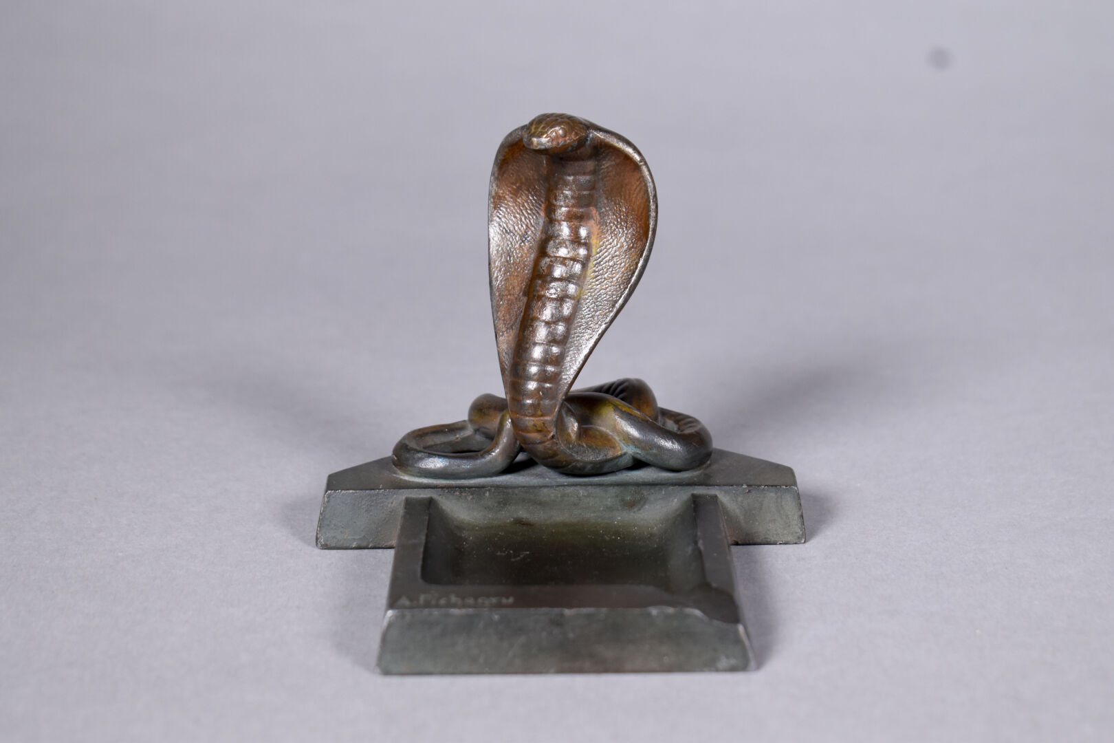 A. PICHEGRU. Cendrier en métal patiné vert et brun à décor d’un cobra. Signé. Haut. : 19 cm.