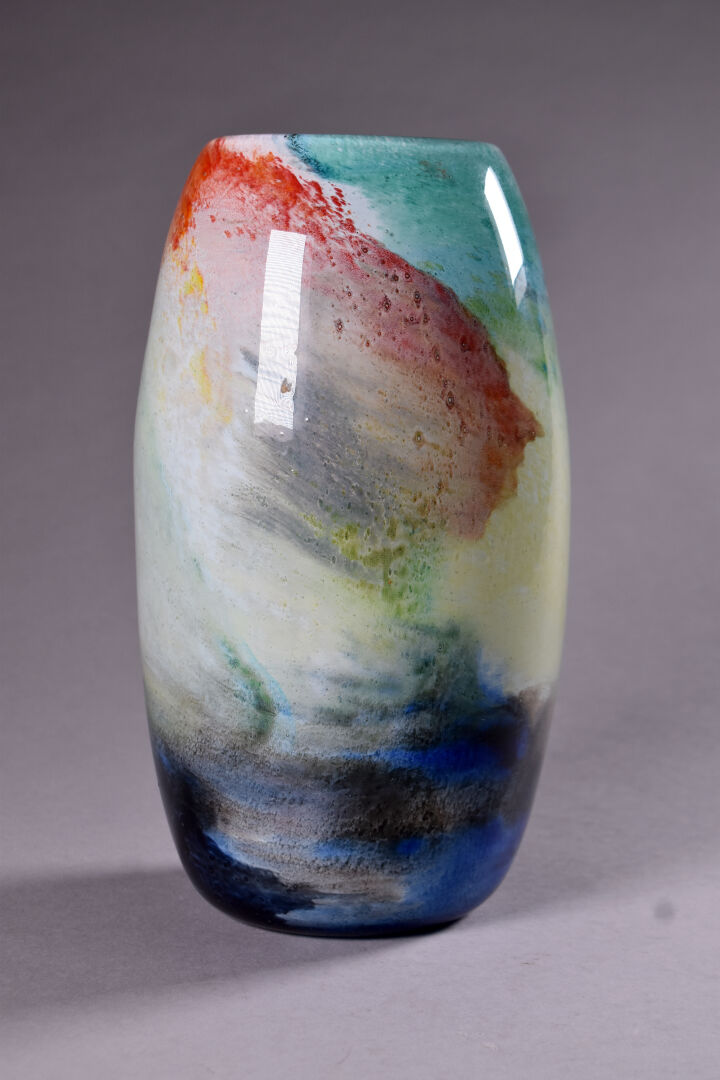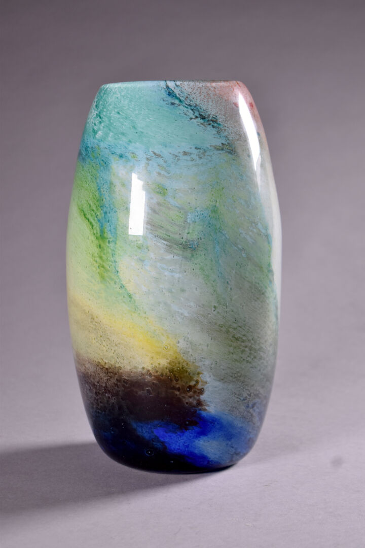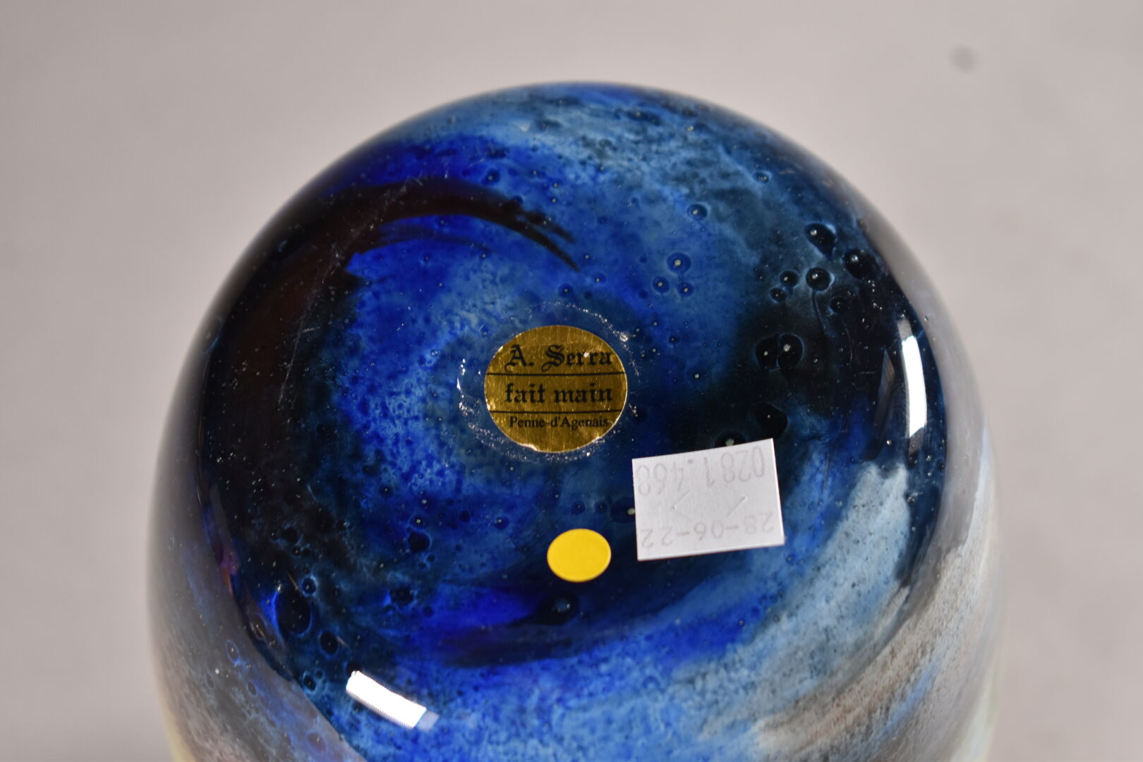 A. SERRA. Penne d’Agenais. Vase rouleau à décor en vert, jaune et bleu. Haut. : 27 cm.