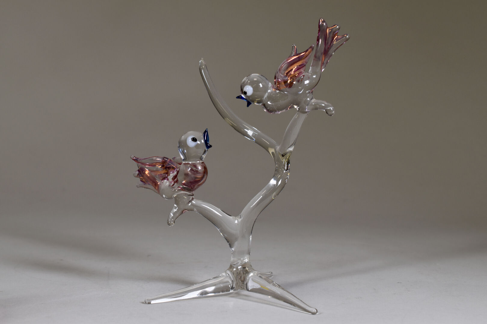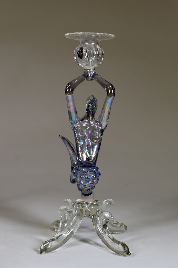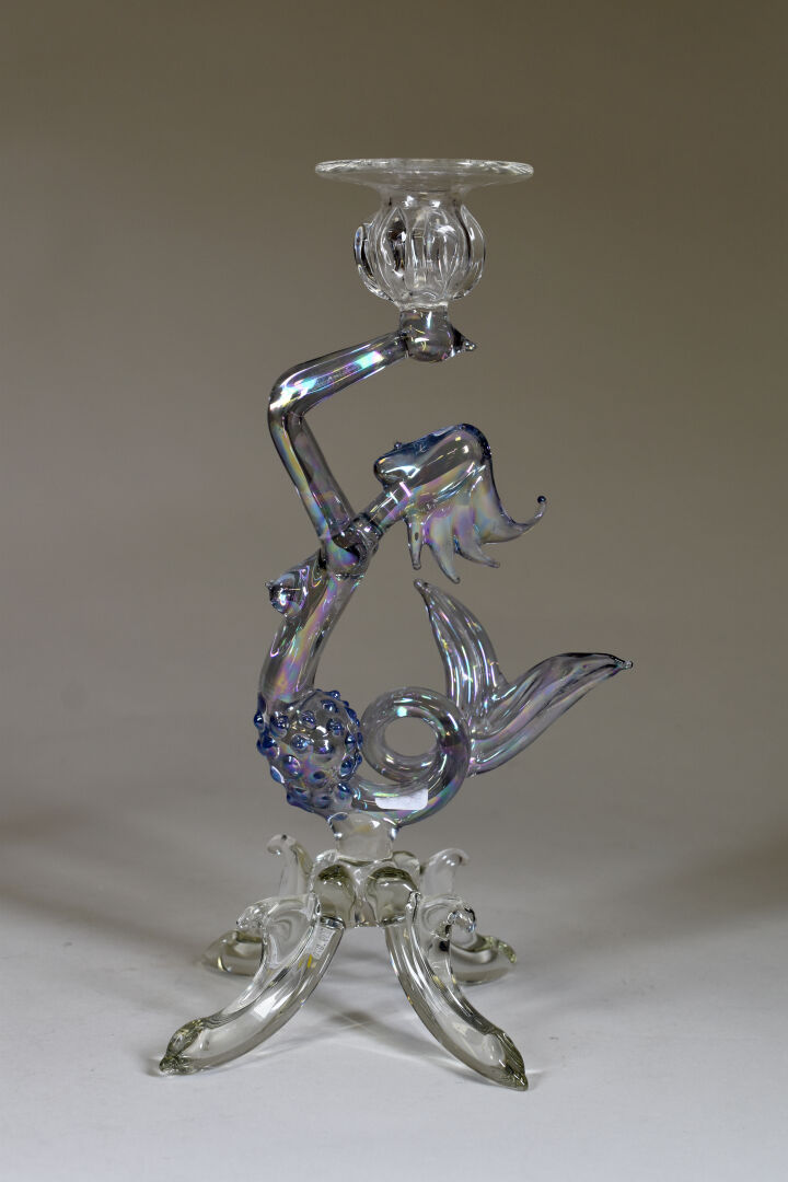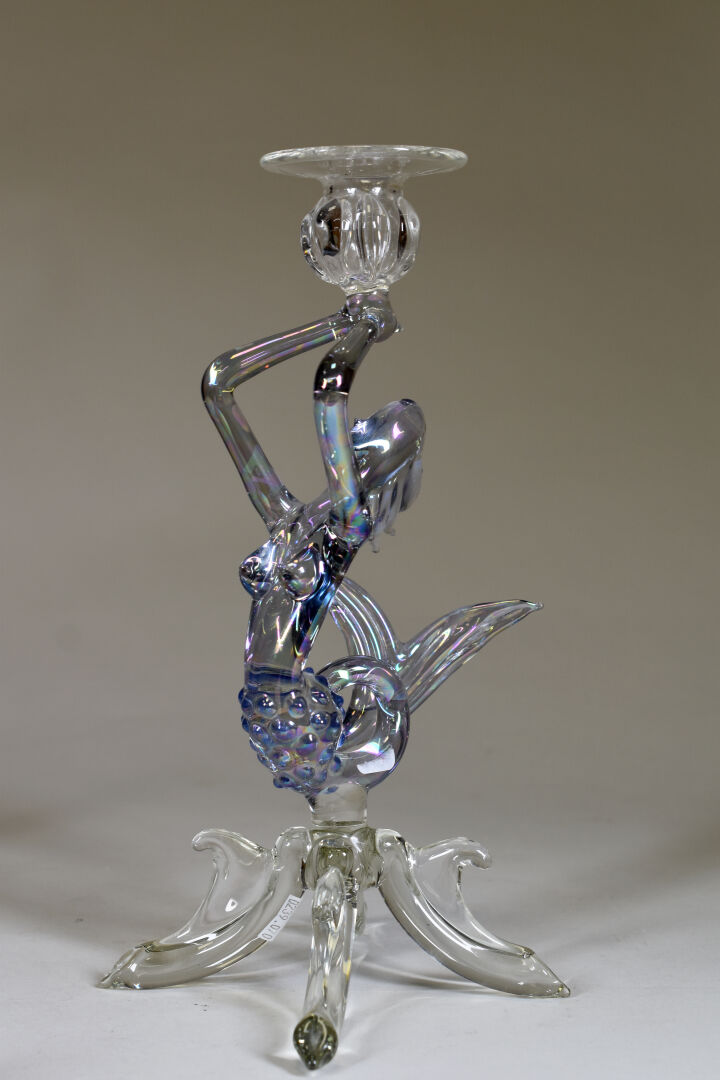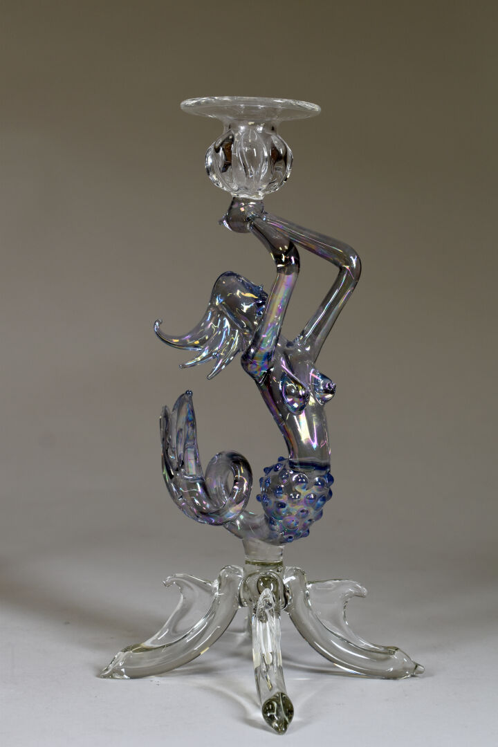 A. VIALAS. Deux figures en verre, un bougeoir à décor d’une sirène et un couple d’oiseaux branchés. Haut. du bougeoir : 30 cm.