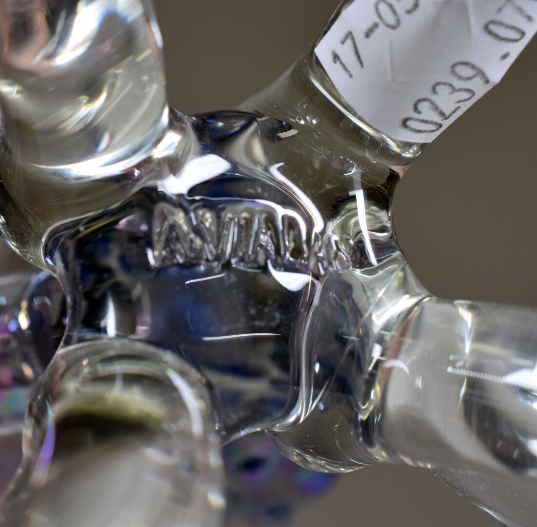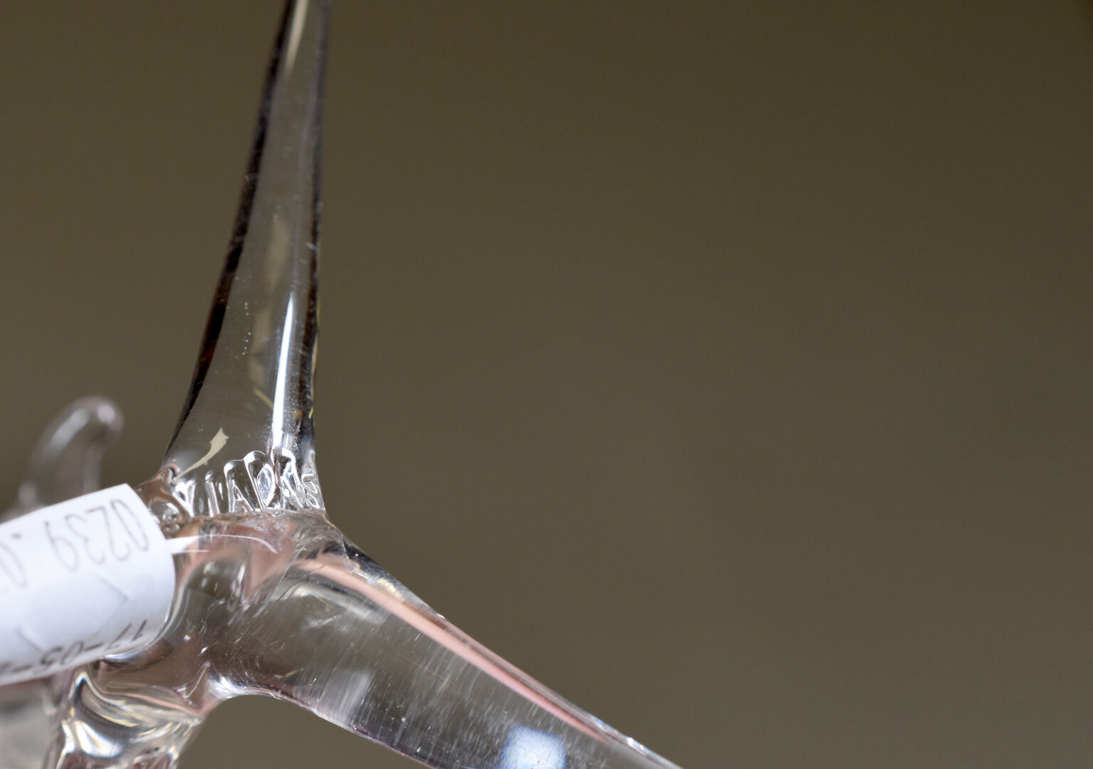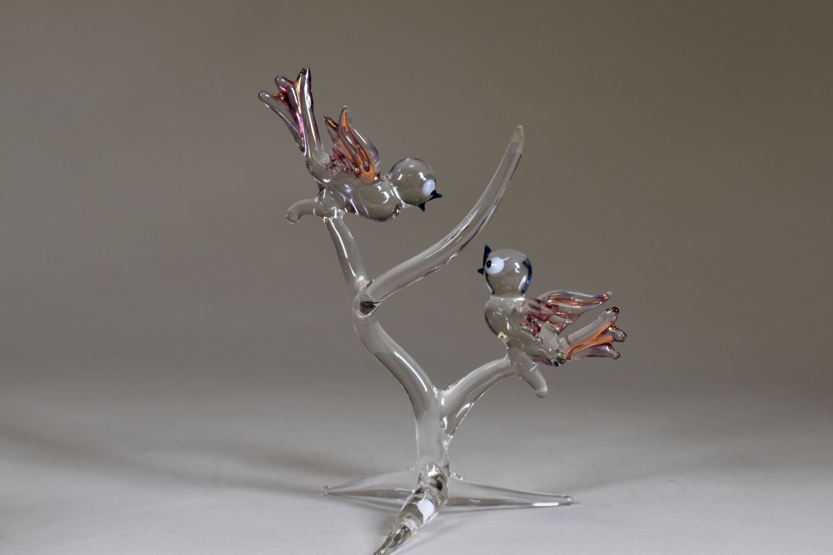 A. VIALAS. Deux figures en verre, un bougeoir à décor d’une sirène et un couple d’oiseaux branchés. Haut. du bougeoir : 30 cm.