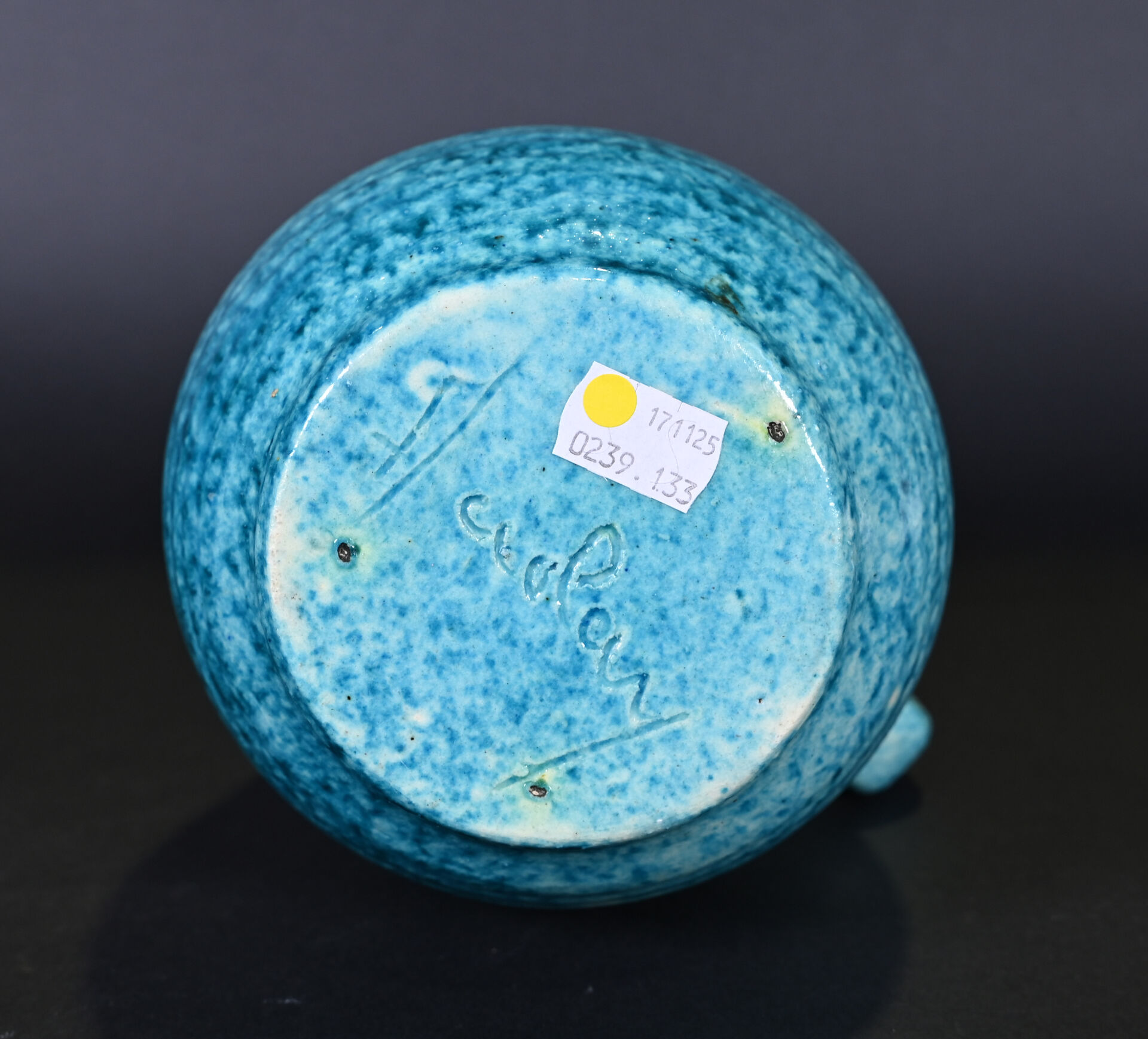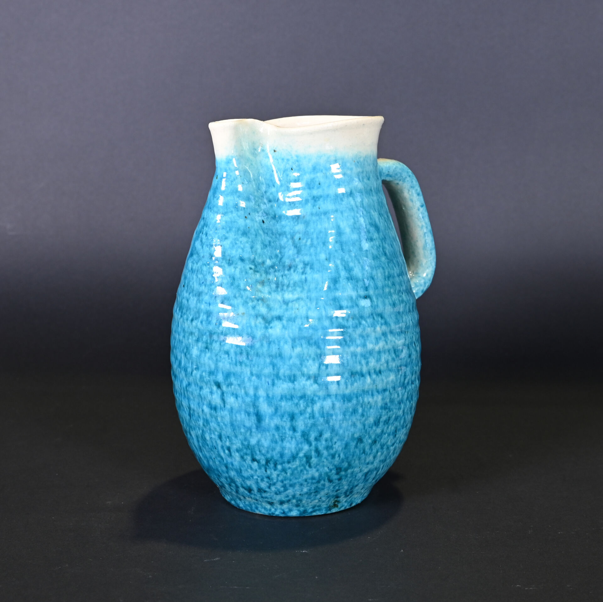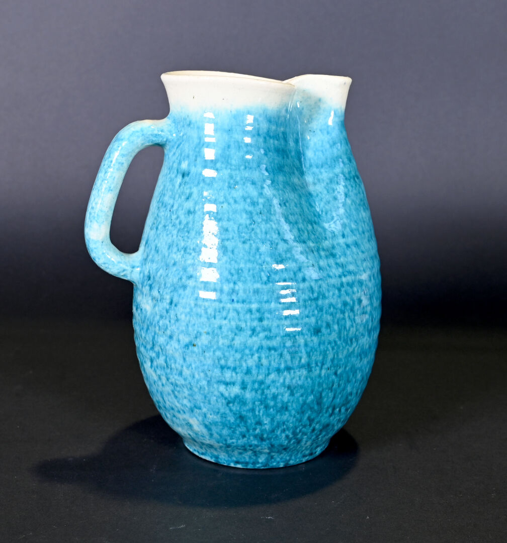 ACCOLAY. Verseuse en céramique côtelée émaillée d’un dégradé de turquoise. Marquée au dessous. Haut. : 24 cm.