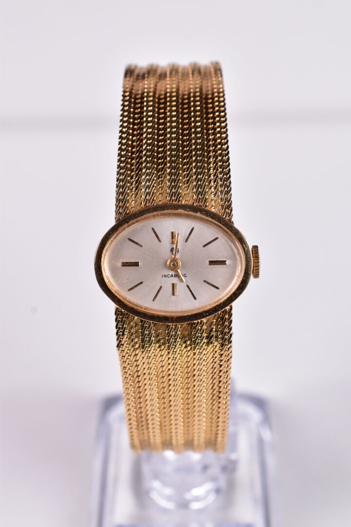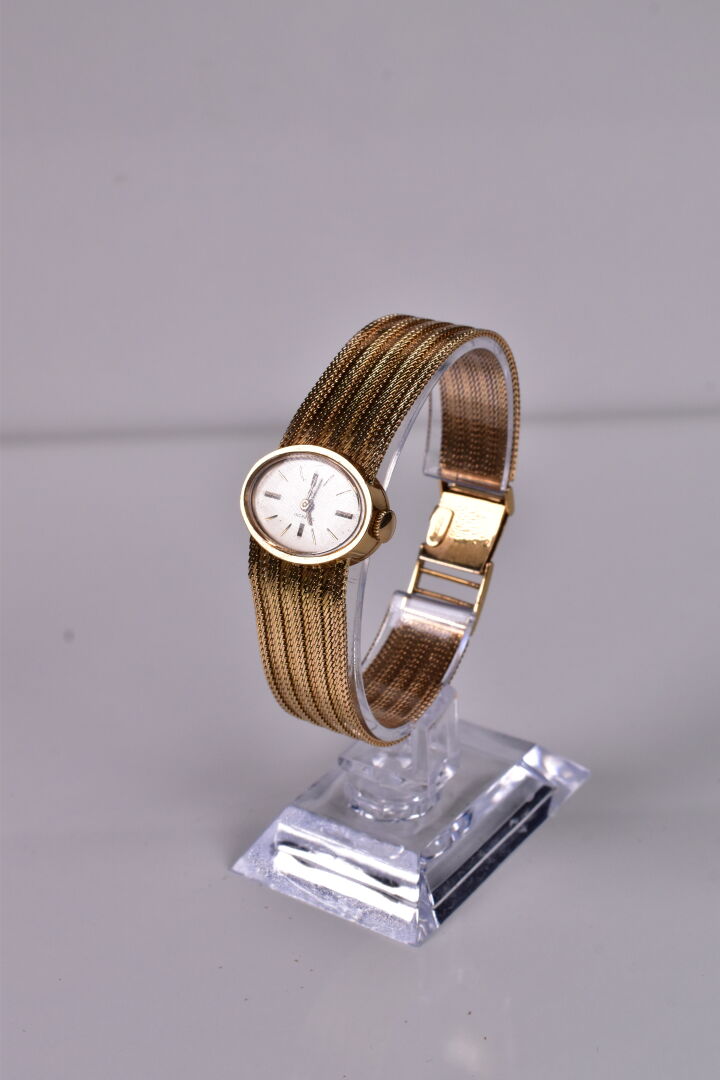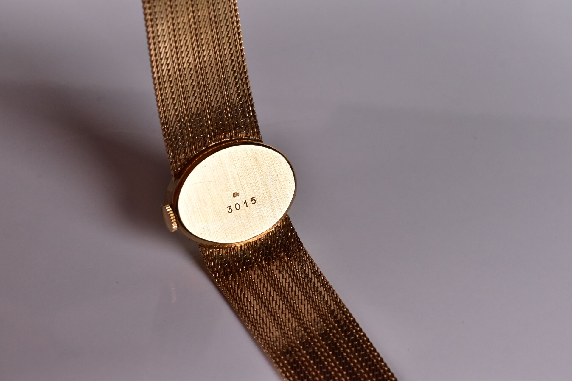 ADER. Montre bracelet de dame tout or en or 18K 750/1000e, boitier ovale (22mm). Petit choc au bracelet. Mouvement quartz, fonctionnement non garanti. Poids brut. : 35,5 g. Ecrin.