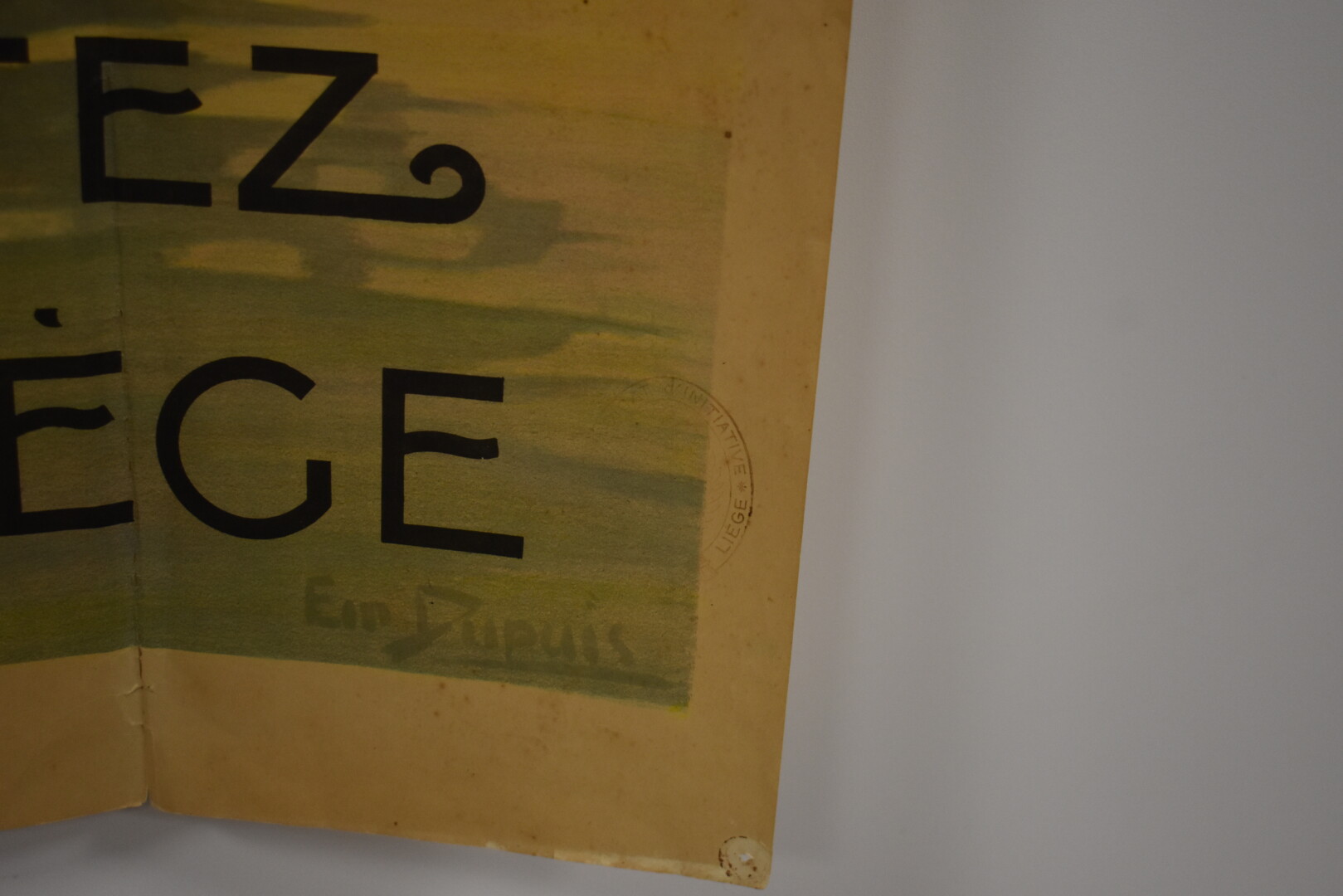 Affiche « CHEMINS DE FER DE L’ETAT BELGE » – Visitez le Pays de Liège (percée, jaunie une déchirure). Début du XXe siècle. 100 x 65 cm.