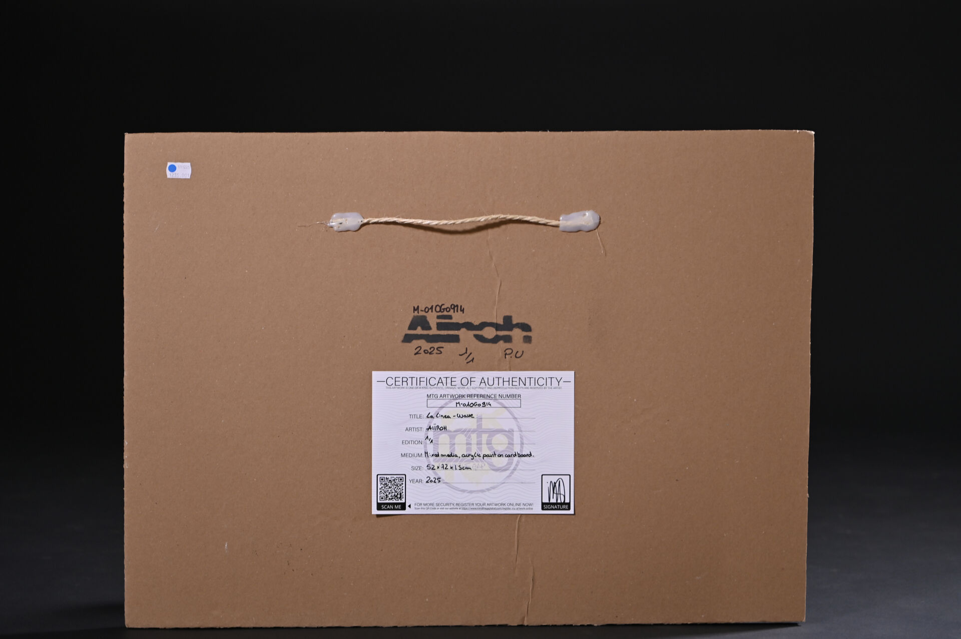 Acrylique et bombe sur carton. Accompagnée d’un certificat au dos, signé et daté 2025.