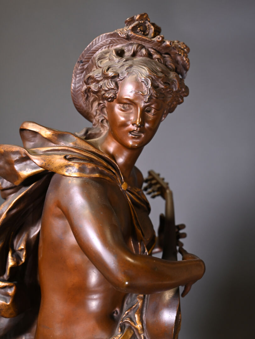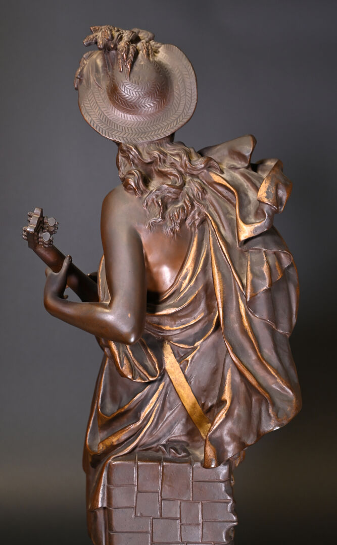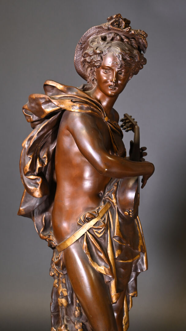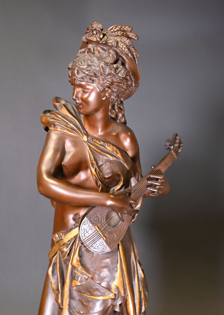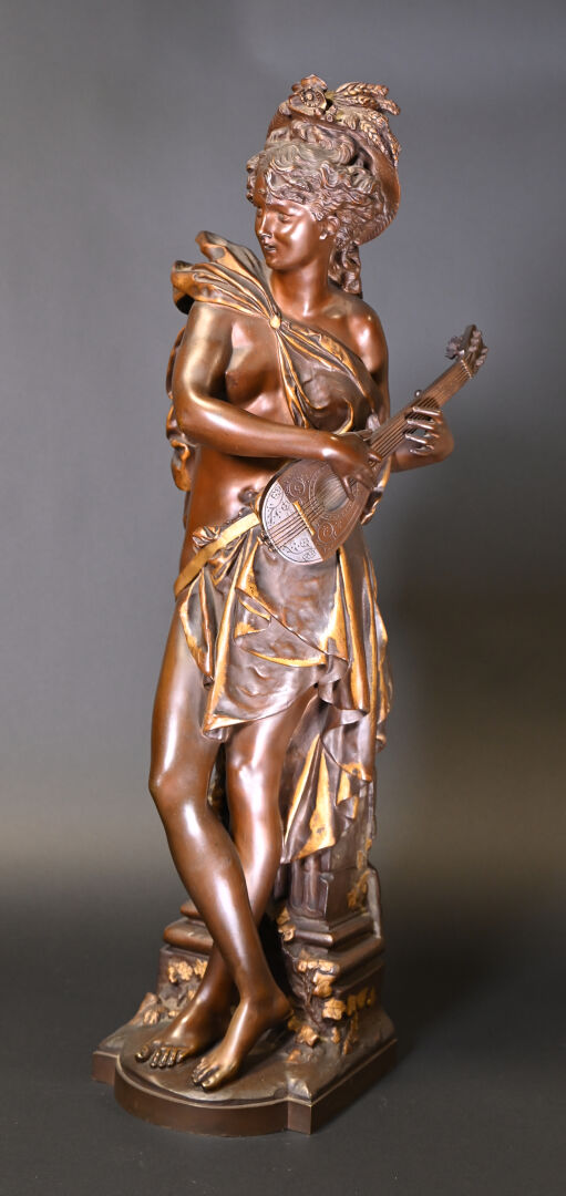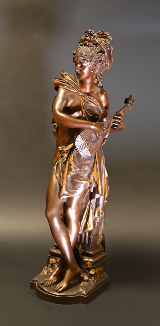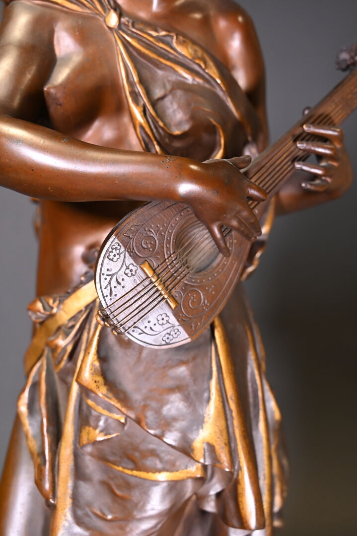Albert CARRIER BELLEUSE (1824-1887). Joueuse de mandoline en bronze patiné médaille et or. Signé à la base. Haut. : 91,5 cm.