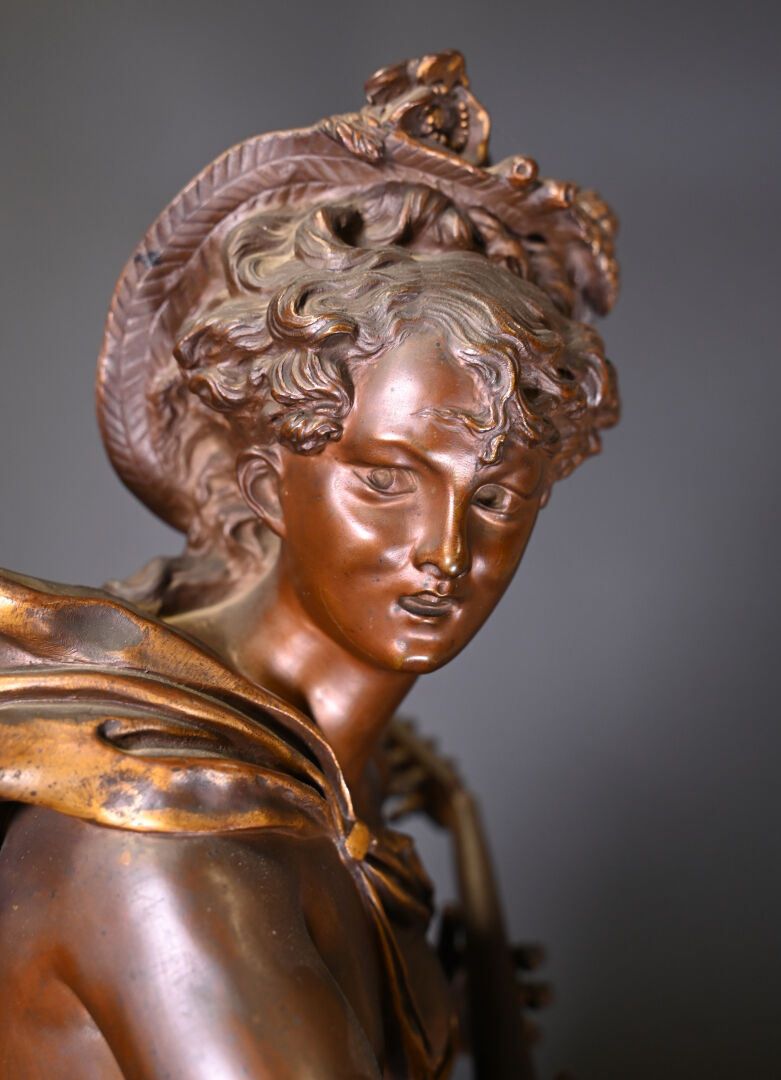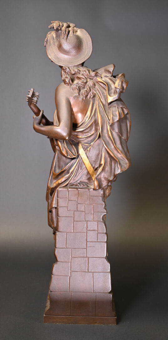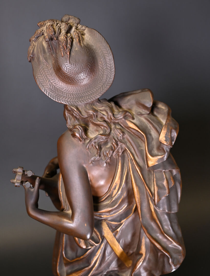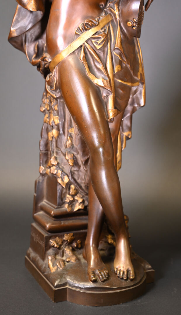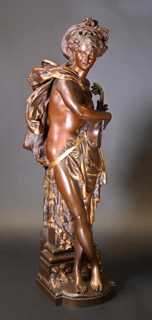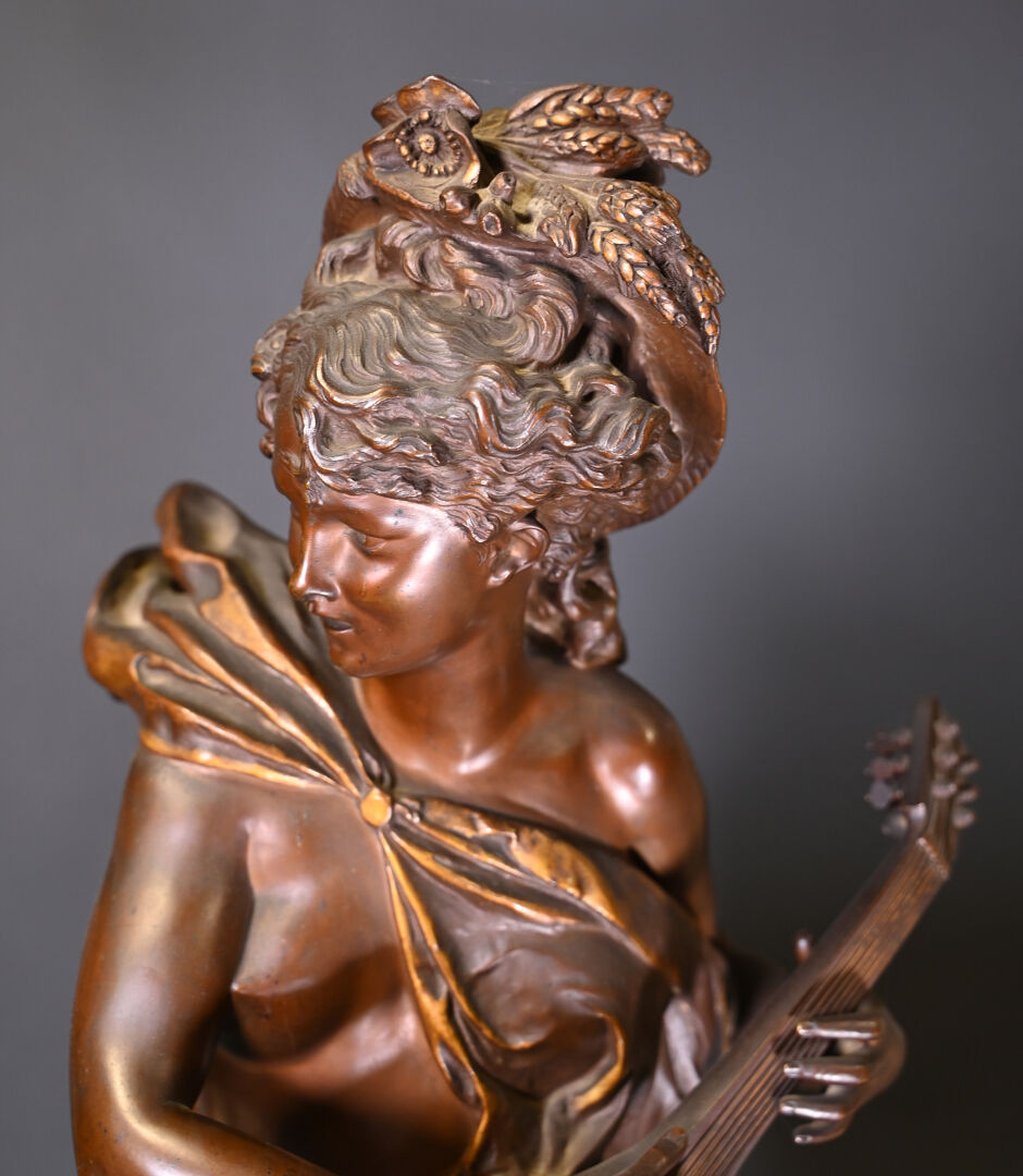 Albert CARRIER BELLEUSE (1824-1887). Joueuse de mandoline en bronze patiné médaille et or. Signé à la base. Haut. : 91,5 cm.