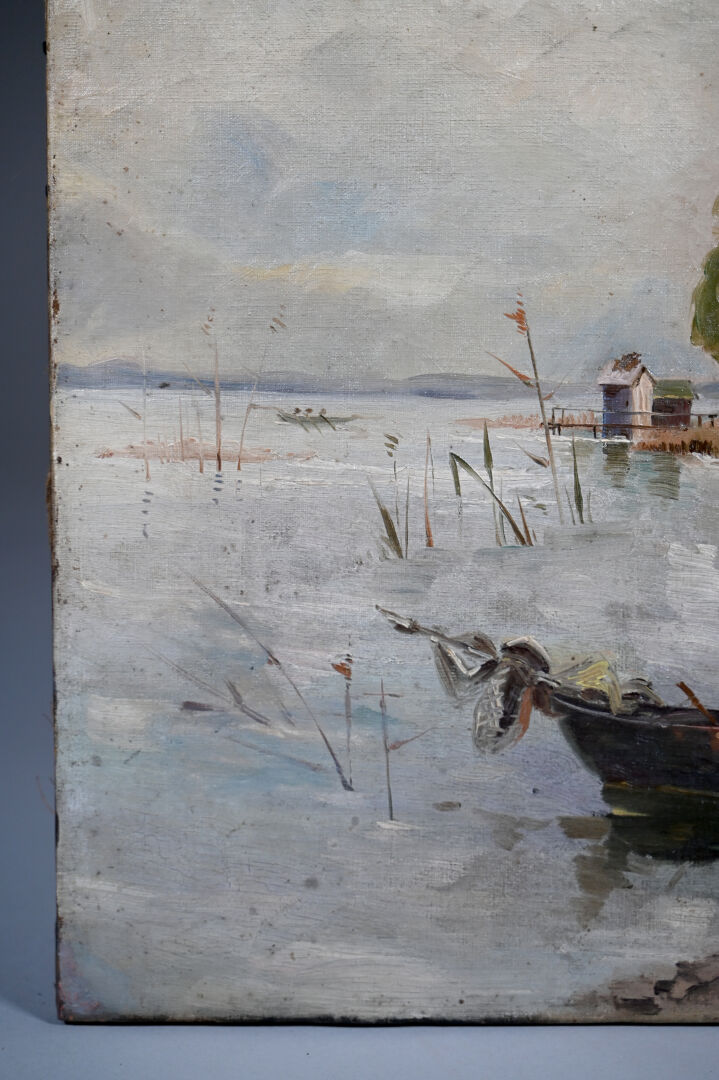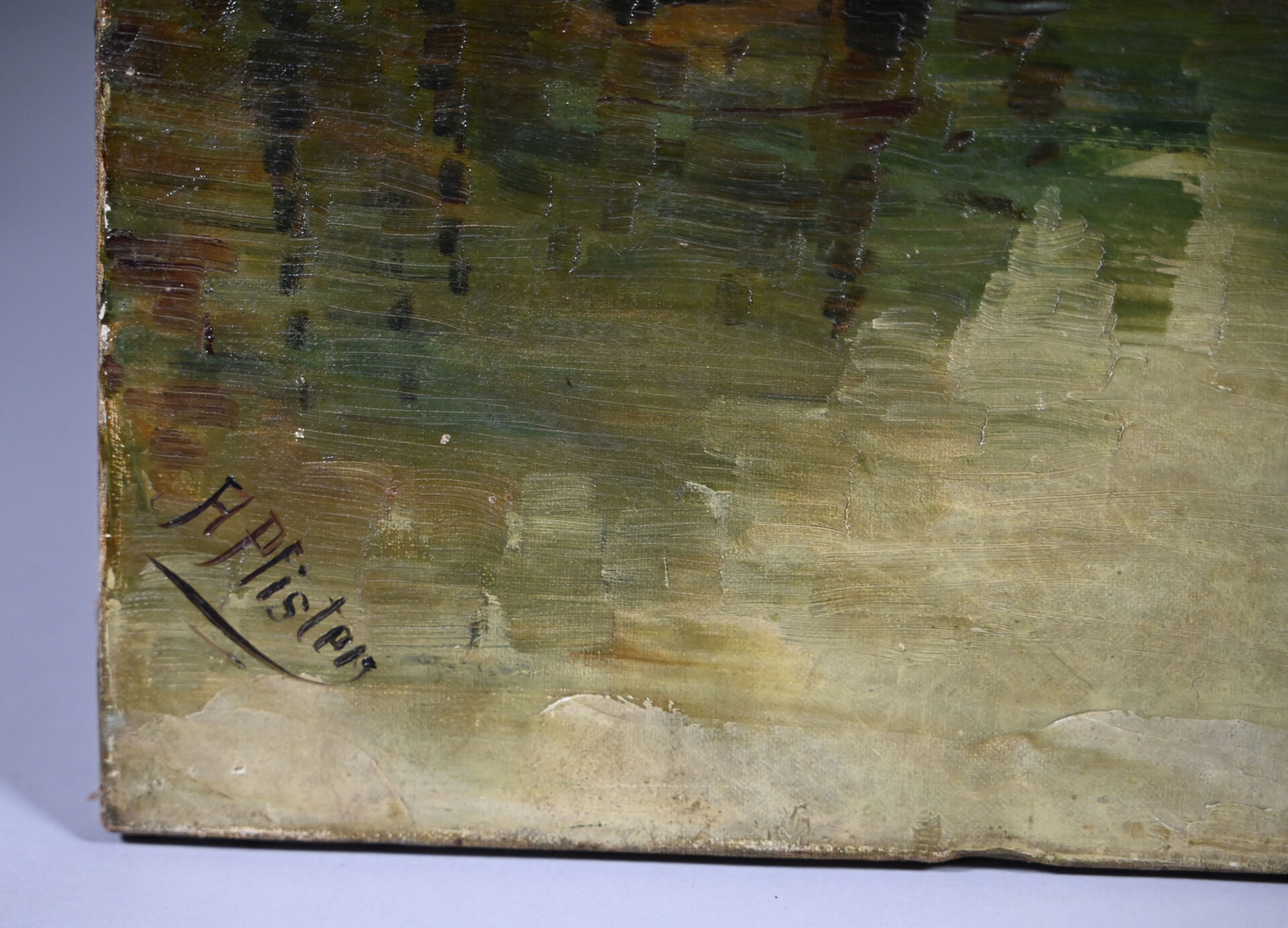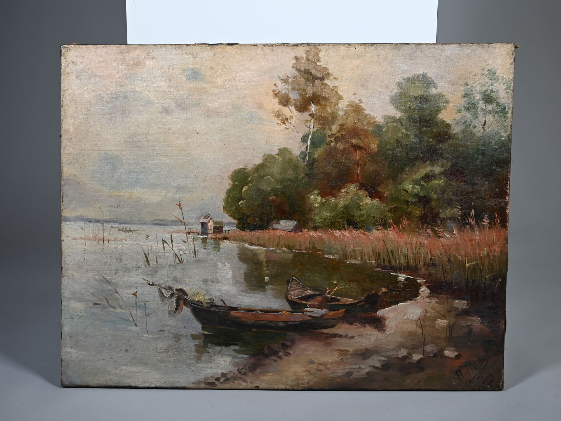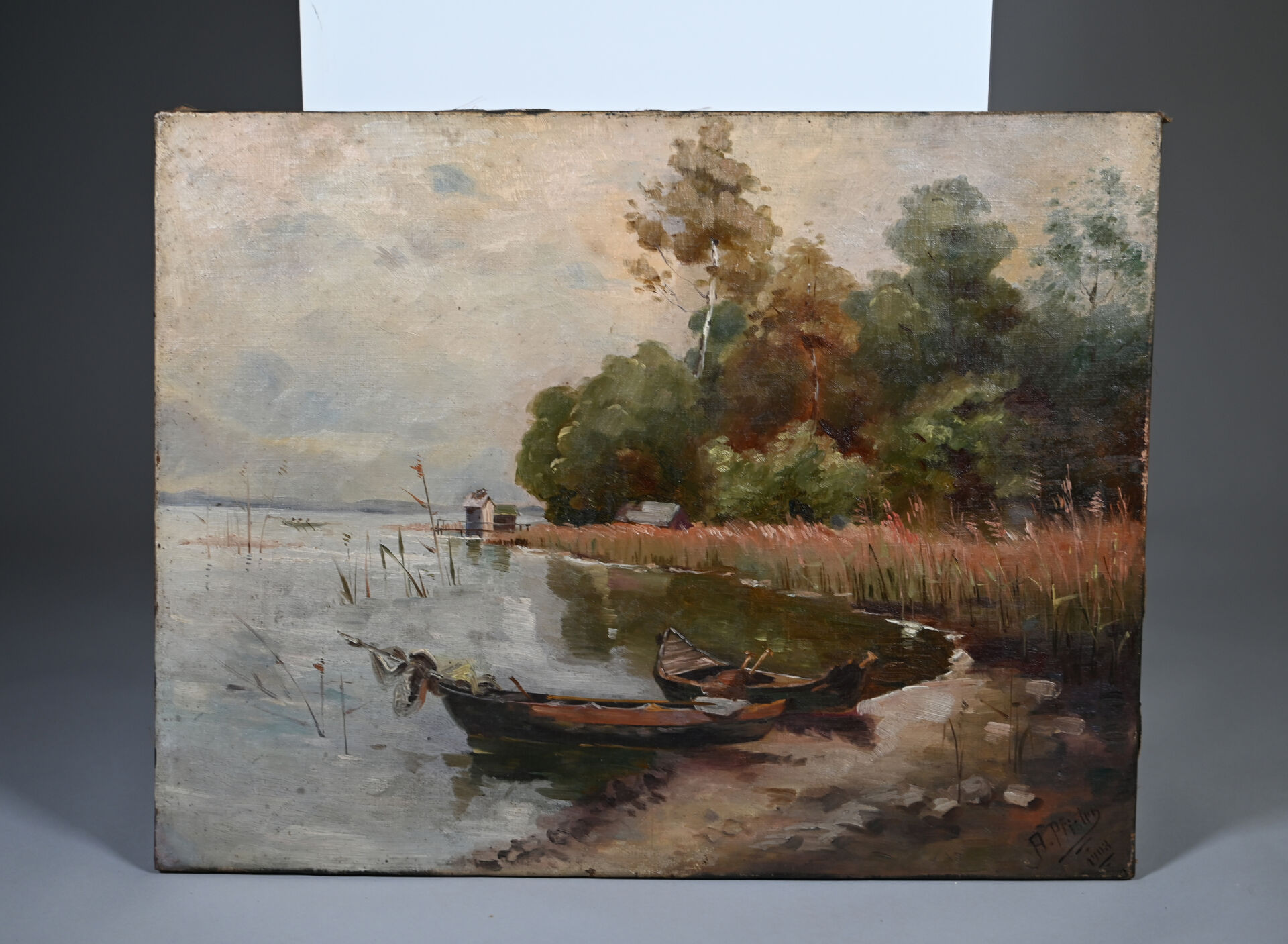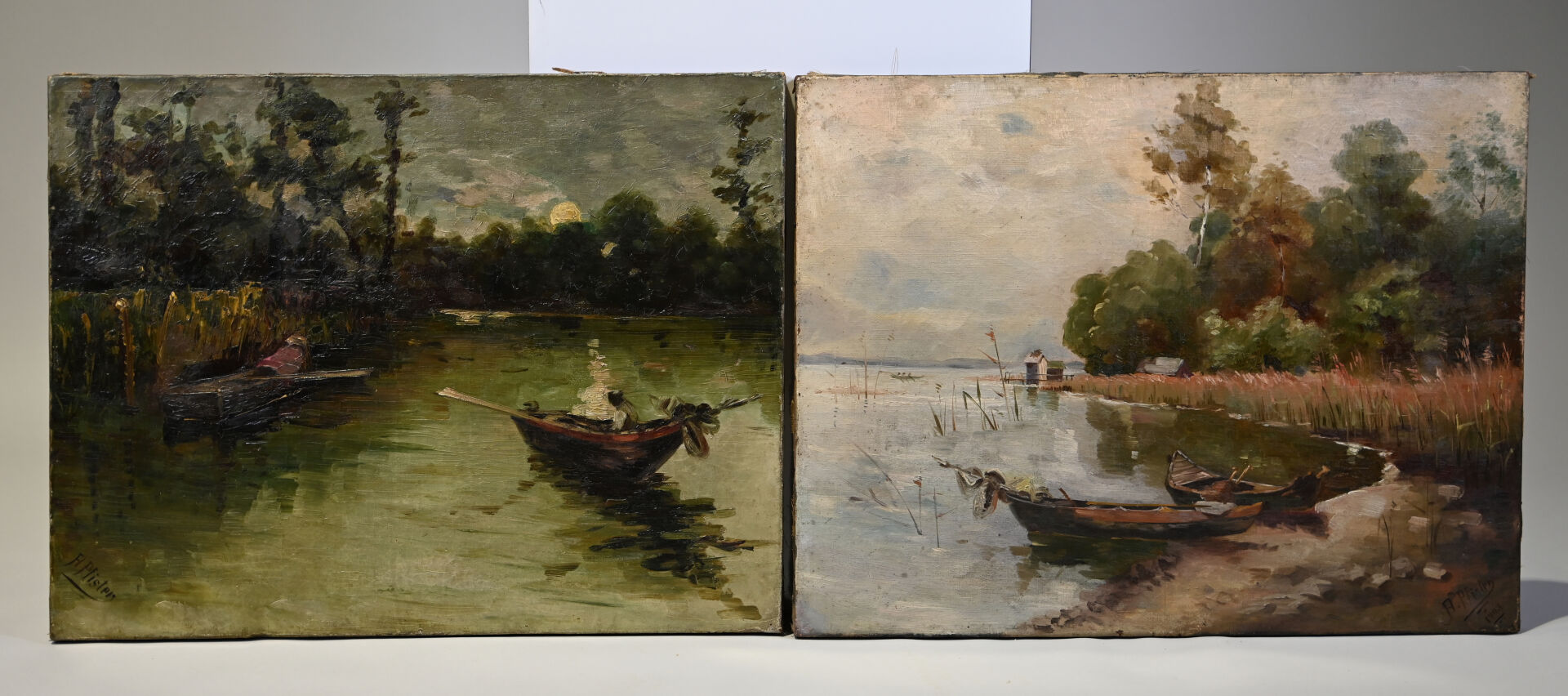 Albert PFISTER (1884-1978). Bords de lac. Deux huiles sur toiles signées et bas à gauche et en bas à droite et une datée 1908 (restaurations). 50,5 x 65 cm.