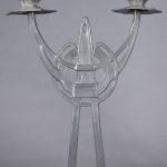 Albert REIMANN (XIXe-XXe siècle). Paire de chandeliers « Candlestick » en métal à deux lumières (une petite déformation sur une coupelle pour un). Modèle de1902. Haut. : 39,5 cm.